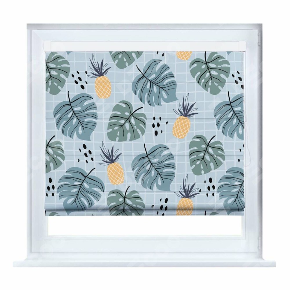 Римская штора производителя «Cortin», устанавливается на створку окна, пошита из ткани блэкаут с нанесением сублимационной печати «Ананасы и листья монстеры». Штора шьётся по индивидуальным размерам, для данного типа римской шторы возможная ширина от 35 до 150 см., высота до 250 см.