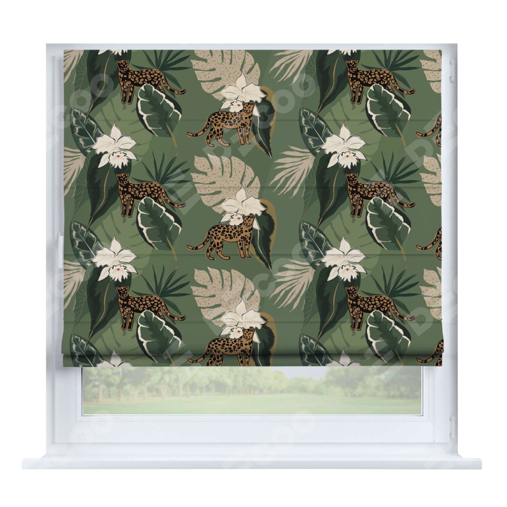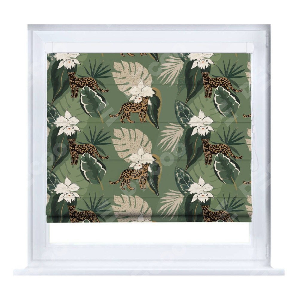 Римская штора производителя «Cortin», устанавливается на створку окна, пошита из ткани блэкаут с нанесением сублимационной печати «В тропическом лесу». Штора шьётся по индивидуальным размерам, для данного типа римской шторы возможная ширина от 35 до 150 см., высота до 250 см.