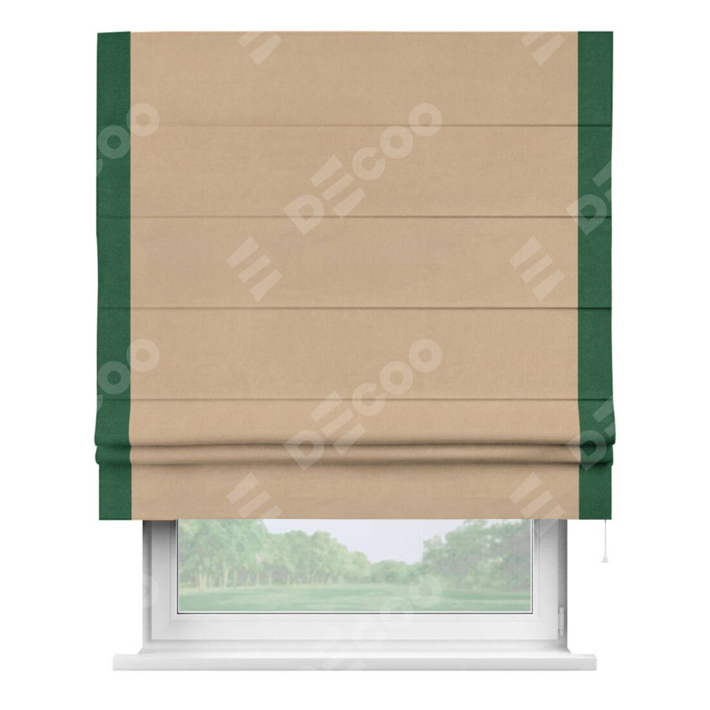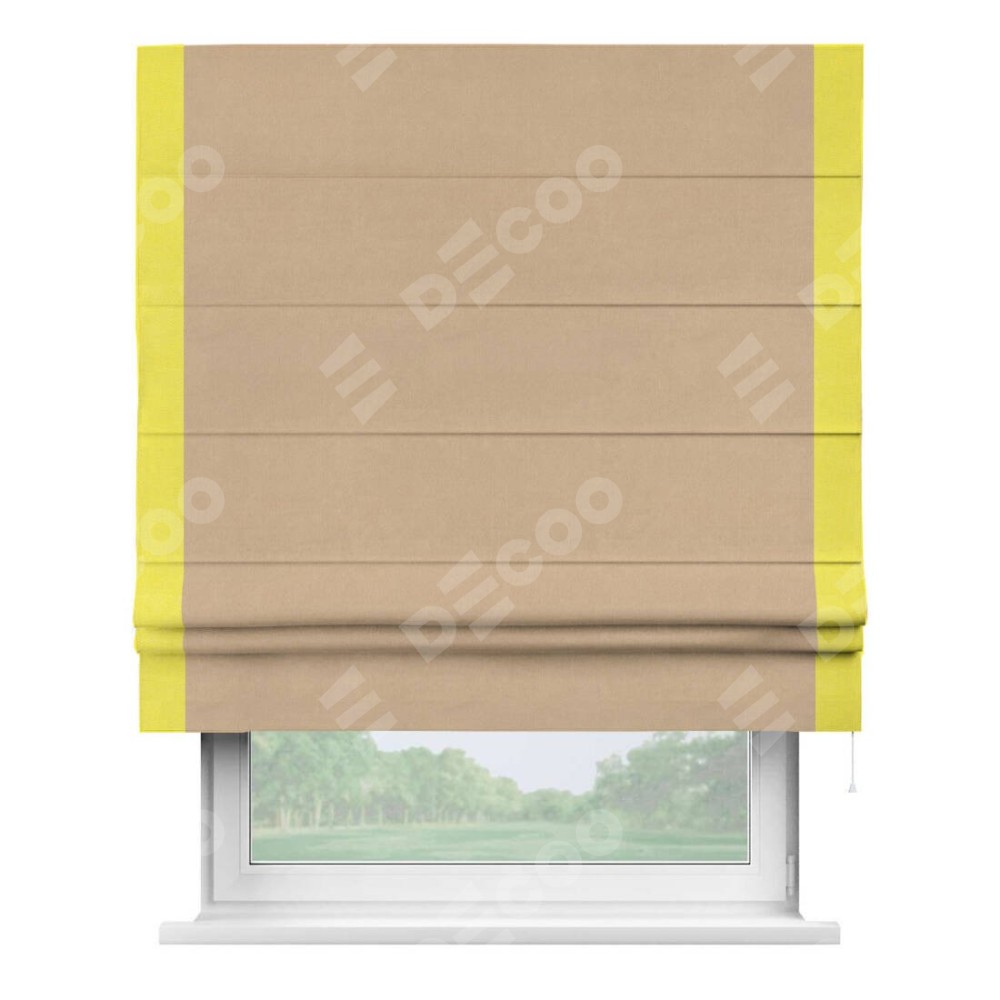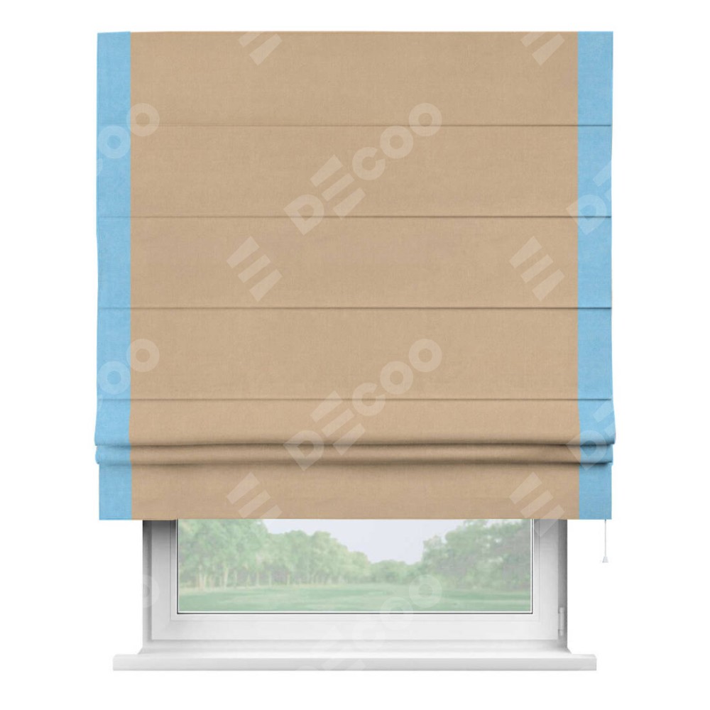 Римская штора производителя «Cortin», используется для проёма, пошита из ткани вельвет песочный, артикул ткани 17740. Отделка шторы кантом «Стрим Дуо», ткань для канта используется из вельвета разной расцветки на выбор. Имеет универсальный механизм и подходит для монтажа: на потолок, на стену и в нишу.