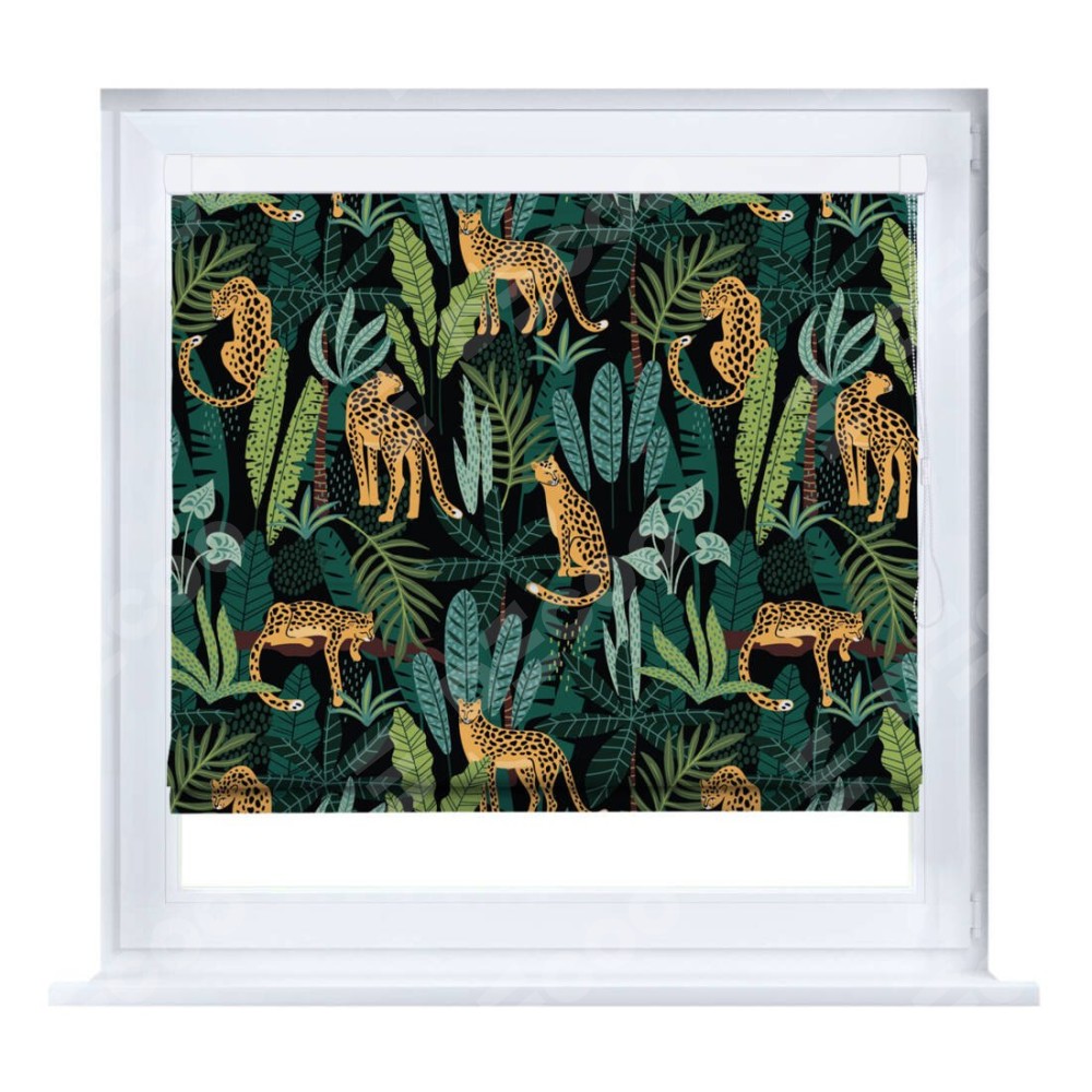 Римская штора производителя «Cortin», устанавливается на створку окна, пошита из ткани блэкаут с нанесением сублимационной печати «Леопарды в джунглях». Штора шьётся по индивидуальным размерам, для данного типа римской шторы возможная ширина от 35 до 150 см., высота до 250 см.