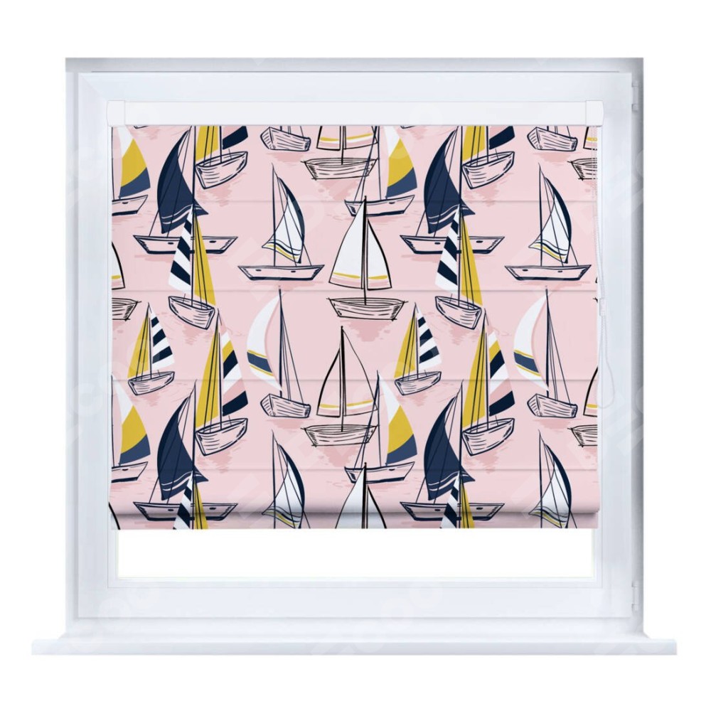 Римская штора производителя «Cortin», устанавливается на створку окна, пошита из ткани блэкаут с нанесением сублимационной печати «Парусная регата». Штора шьётся по индивидуальным размерам, для данного типа римской шторы возможная ширина от 35 до 150 см., высота до 250 см.