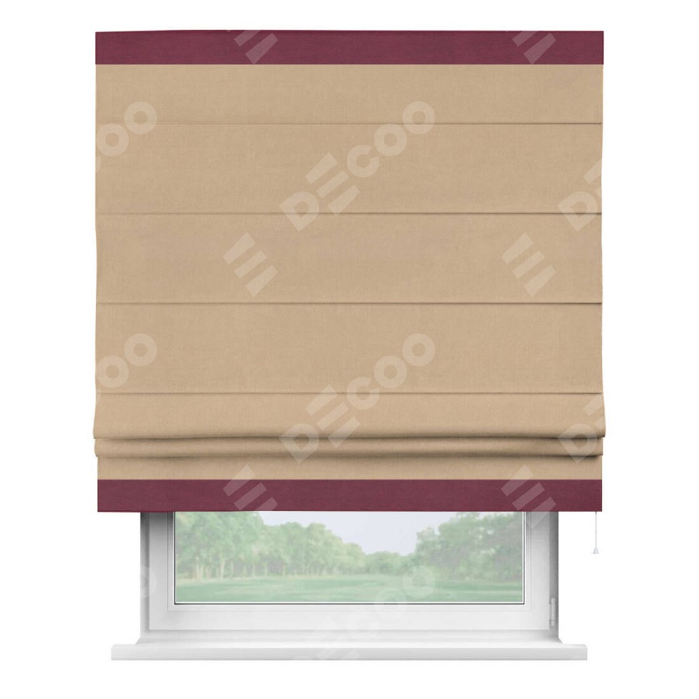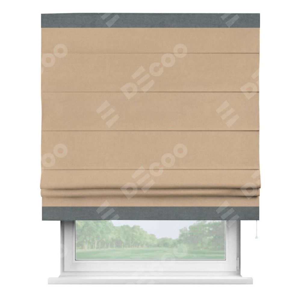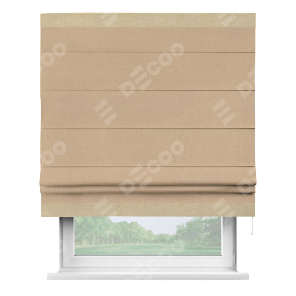 Римская штора производителя «Cortin», используется для проёма, пошита из ткани вельвет песочный, артикул ткани 17740. Отделка шторы кантом «Горизонт», ткань для канта используется из вельвета разной расцветки на выбор. Имеет универсальный механизм и подходит для монтажа: на потолок, на стену и в нишу.