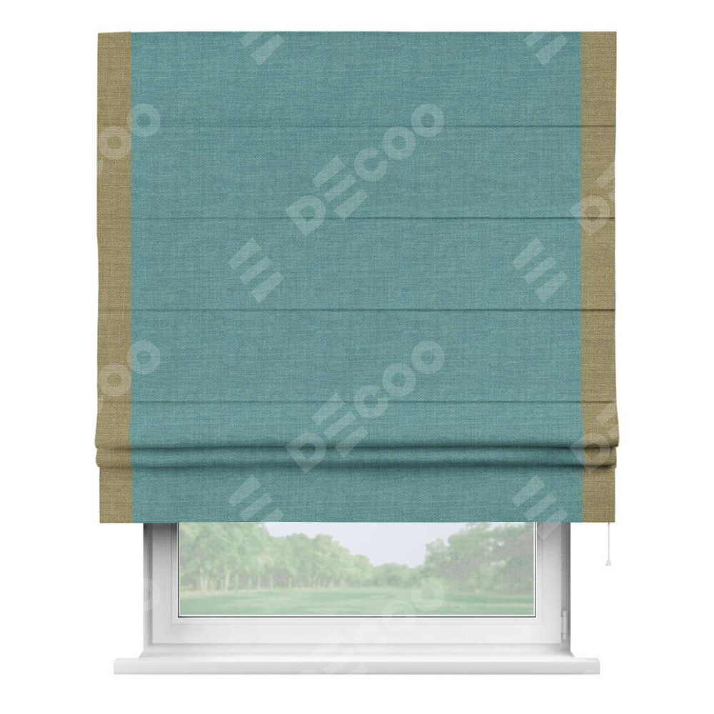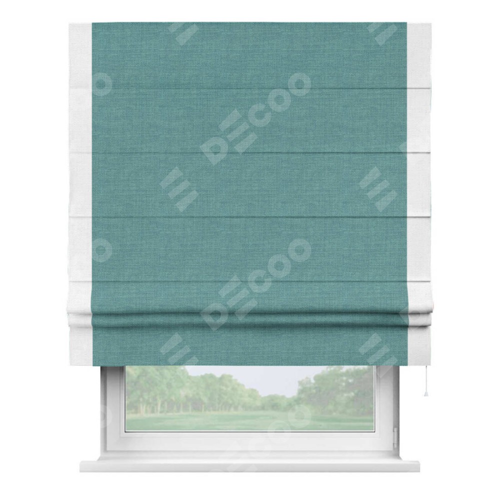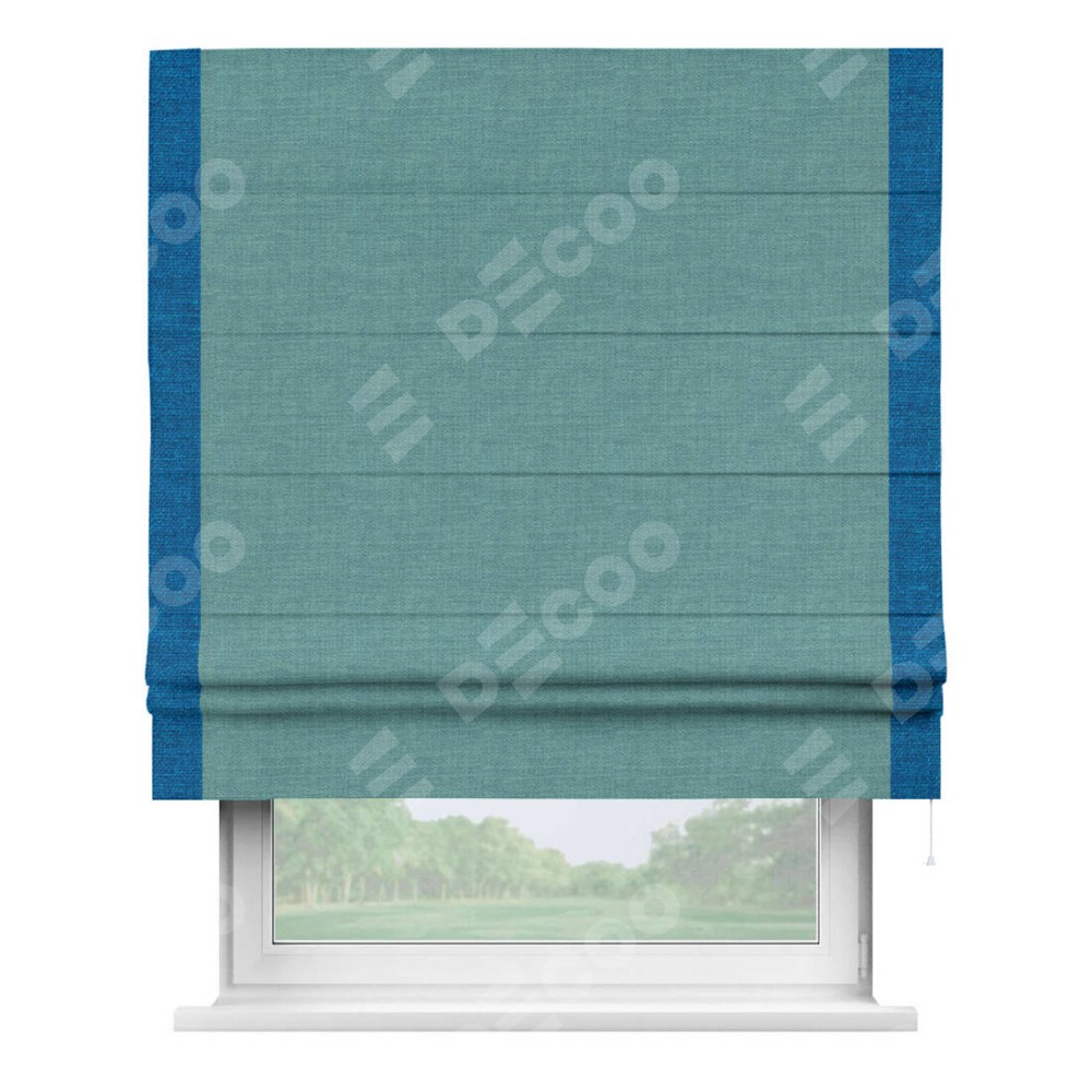 Римская штора производителя «Cortin», используется для проёма, пошита из ткани лён бирюза, артикул 7446. Отделка шторы кантом «Стрим Дуо», ткань для канта используется из льна разной расцветки на выбор. Имеет универсальный механизм и подходит для монтажа: на потолок, на стену и в нишу.