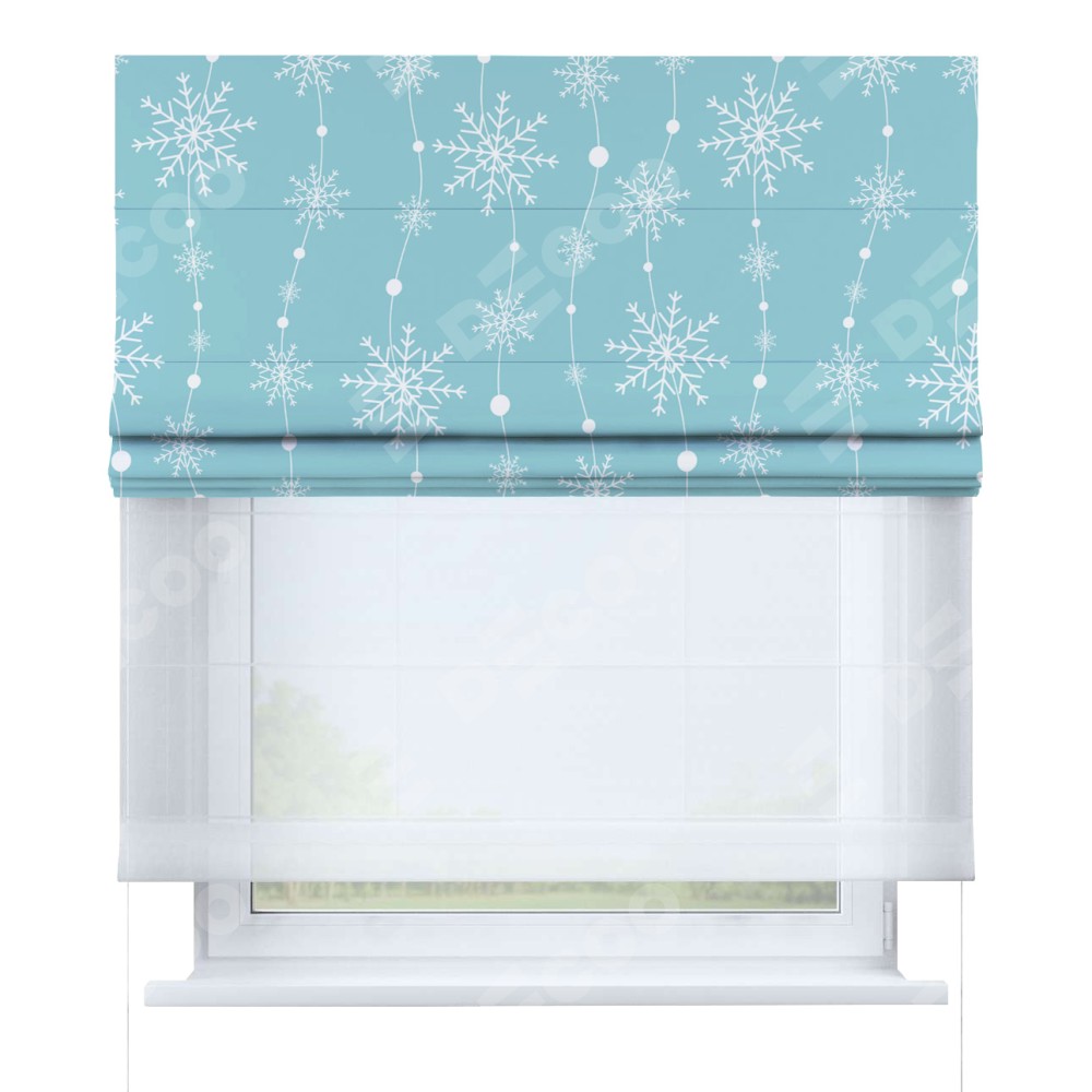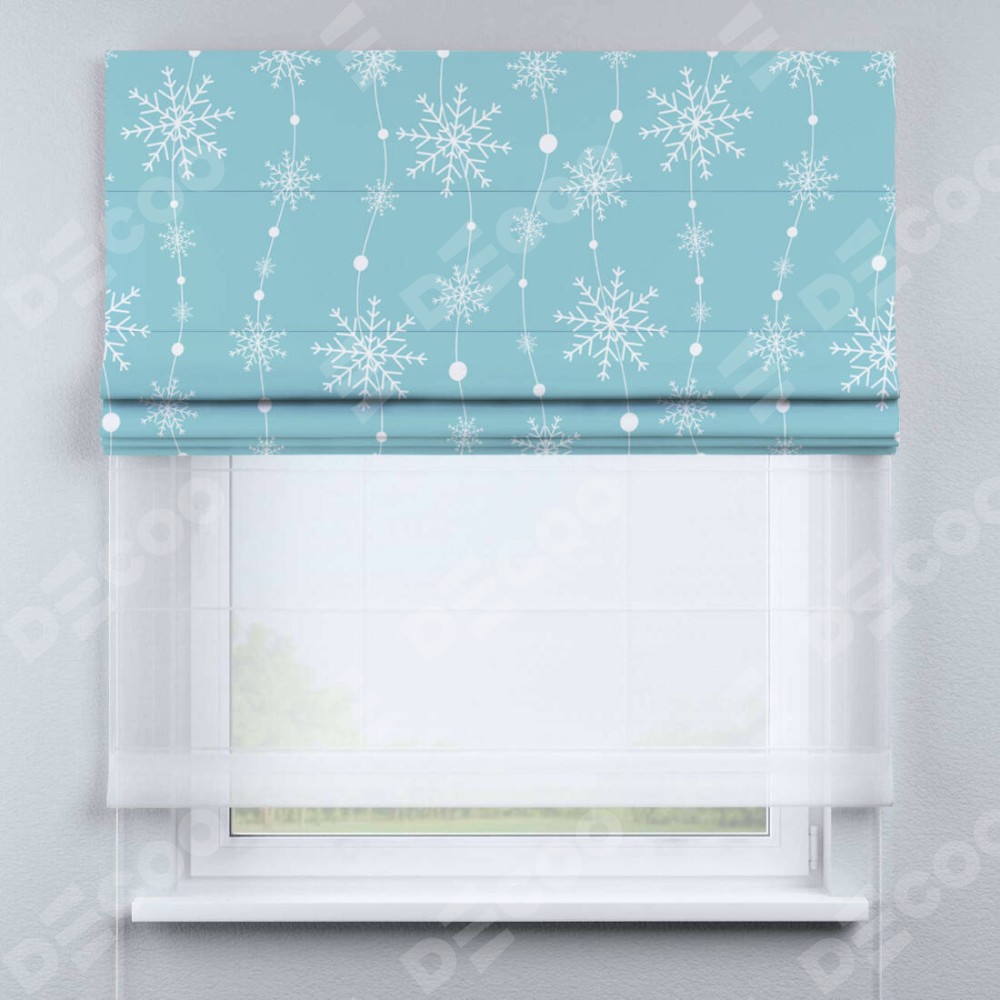 Римская штора день-ночь производителя «Cortin», используется для проёма, пошита из двух полотен, с лицевой блэкаут с нанесением сублимационной печати «Гирлянда из снежинок», вторая ткань тюль (по стандарту комплектуется тюль белого цвета артикул V-01). Имеет универсальный механизм и подходит для монтажа: на потолок, на стену и в нишу.