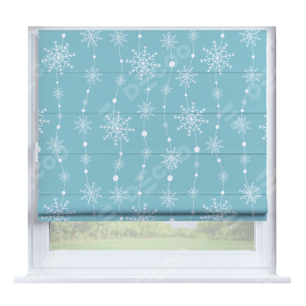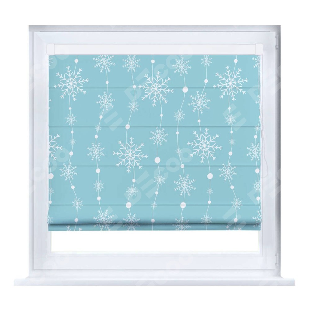 Римская штора производителя «Cortin», устанавливается на створку окна, пошита из ткани блэкаут с нанесением сублимационной печати «Гирлянда из снежинок». Штора шьётся по индивидуальным размерам, для данного типа римской шторы возможная ширина от 35 до 150 см., высота до 250 см.