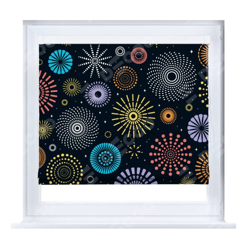 Римская штора производителя «Cortin», устанавливается на створку окна, пошита из ткани блэкаут с нанесением сублимационной печати «Праздничный фейерверк». Штора шьётся по индивидуальным размерам, для данного типа римской шторы возможная ширина от 35 до 150 см., высота до 250 см.
