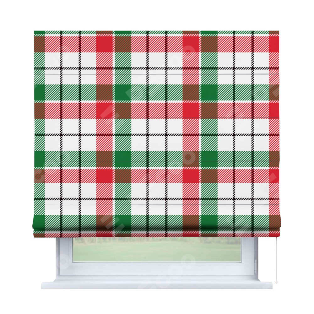 Римская штора производителя «Cortin», используется для проёма, пошита из ткани блэкаут с нанесением сублимационной печати «Трёхцветная клетка». Имеет универсальный механизм и подходит для монтажа: на потолок, на стену и в нишу.