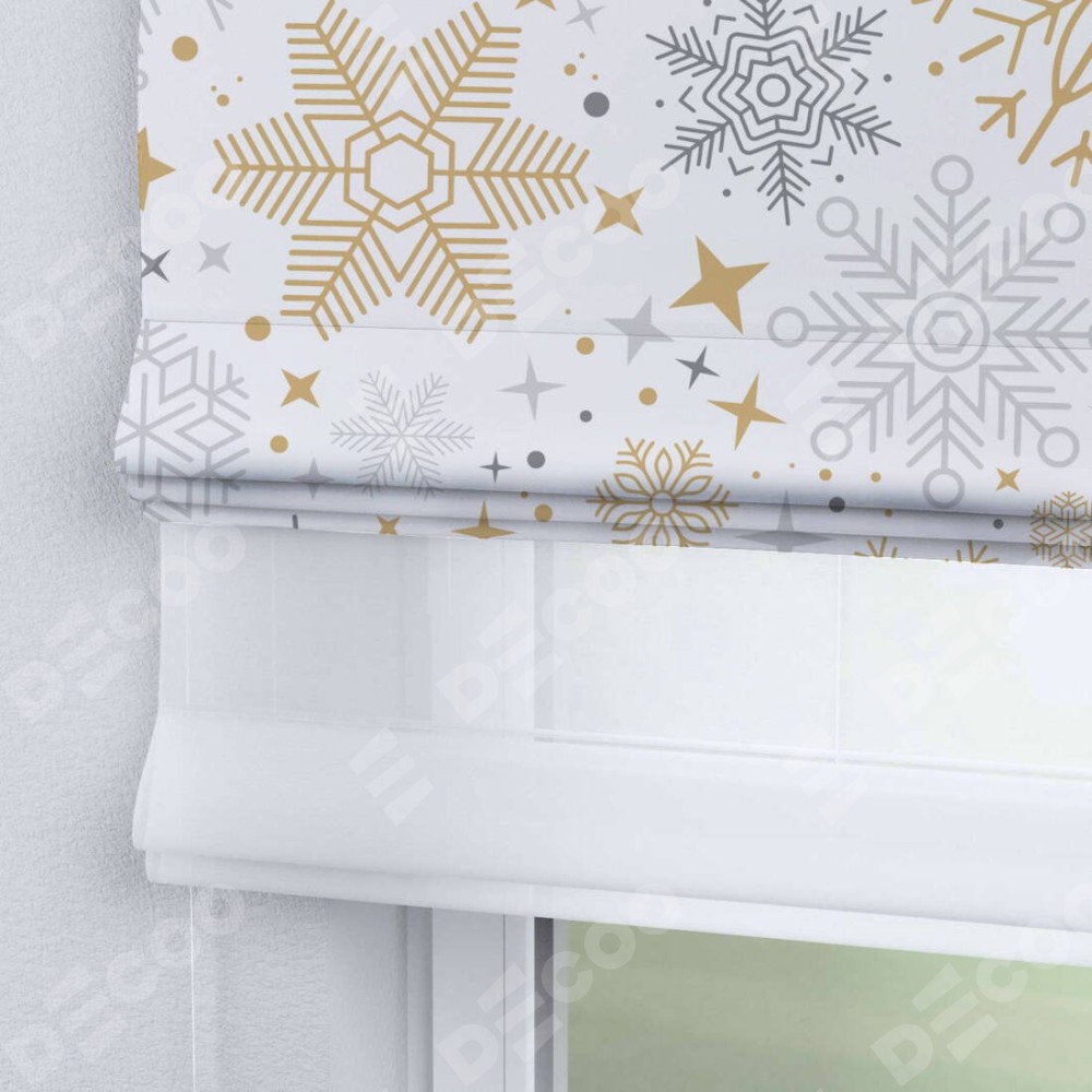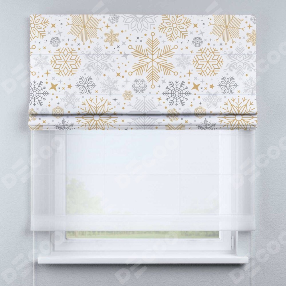 Римская штора день-ночь производителя «Cortin», используется для проёма, пошита из двух полотен, с лицевой блэкаут с нанесением сублимационной печати «Снежное очарование», вторая ткань тюль (по стандарту комплектуется тюль белого цвета артикул V-01). Имеет универсальный механизм и подходит для монтажа: на потолок, на стену и в нишу.