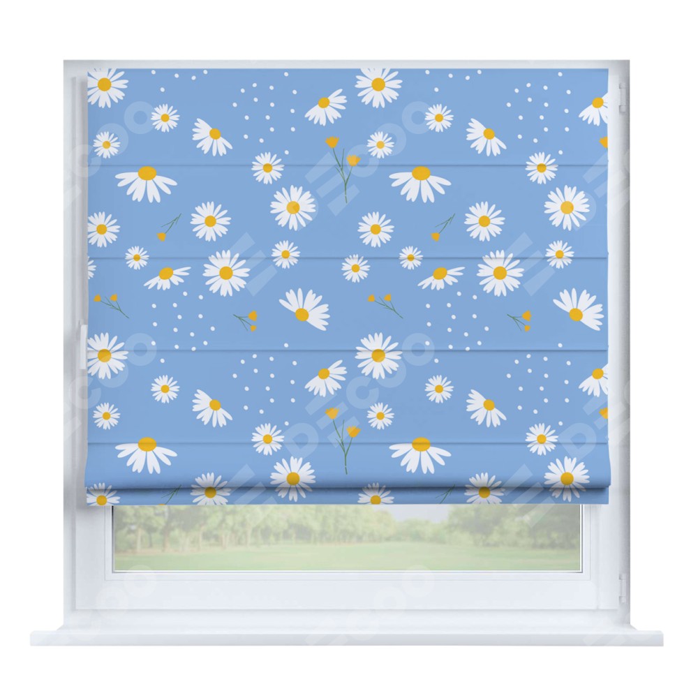 Римская штора производителя «Cortin», устанавливается на створку окна, пошита из ткани блэкаут с нанесением сублимационной печати «Ромашки на голубом». Штора шьётся по индивидуальным размерам, для данного типа римской шторы возможная ширина от 35 до 150 см., высота до 250 см.