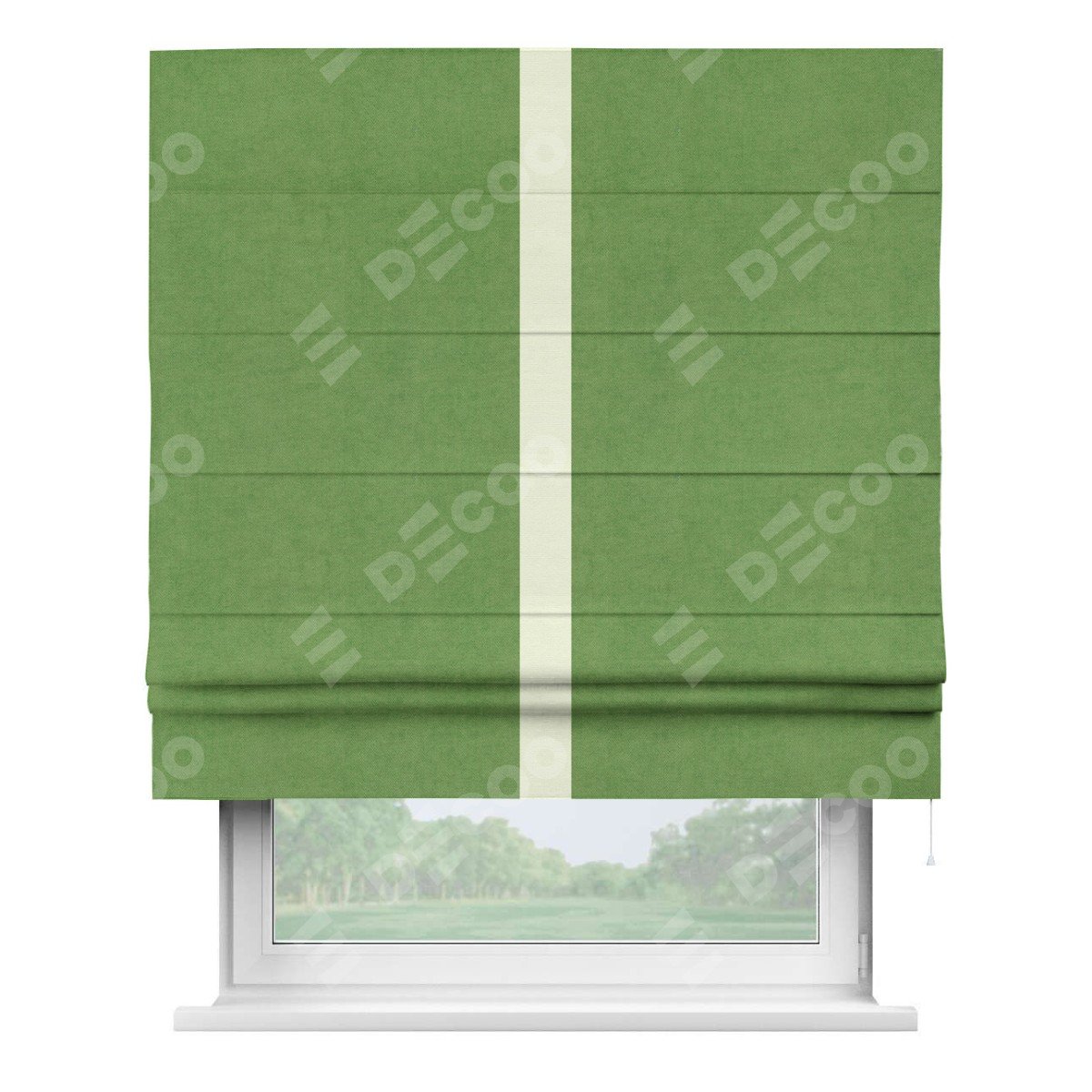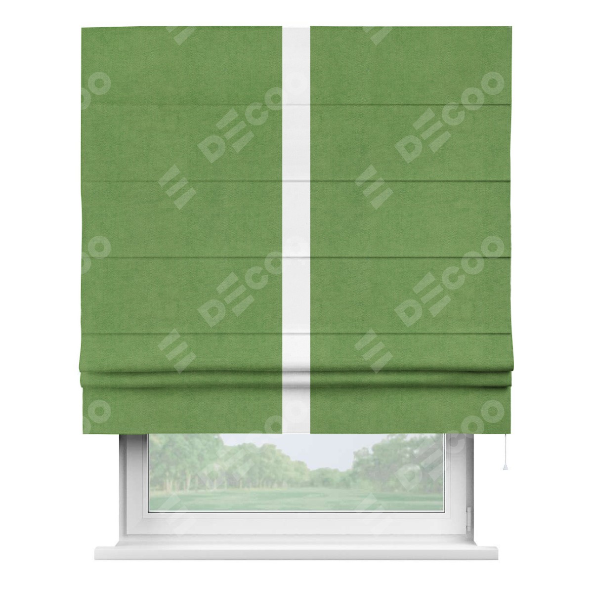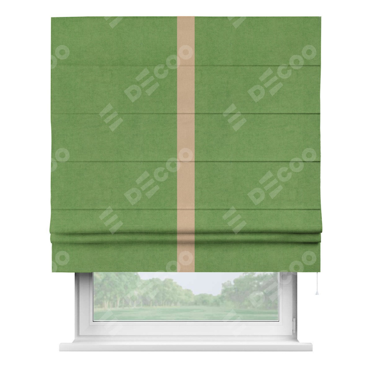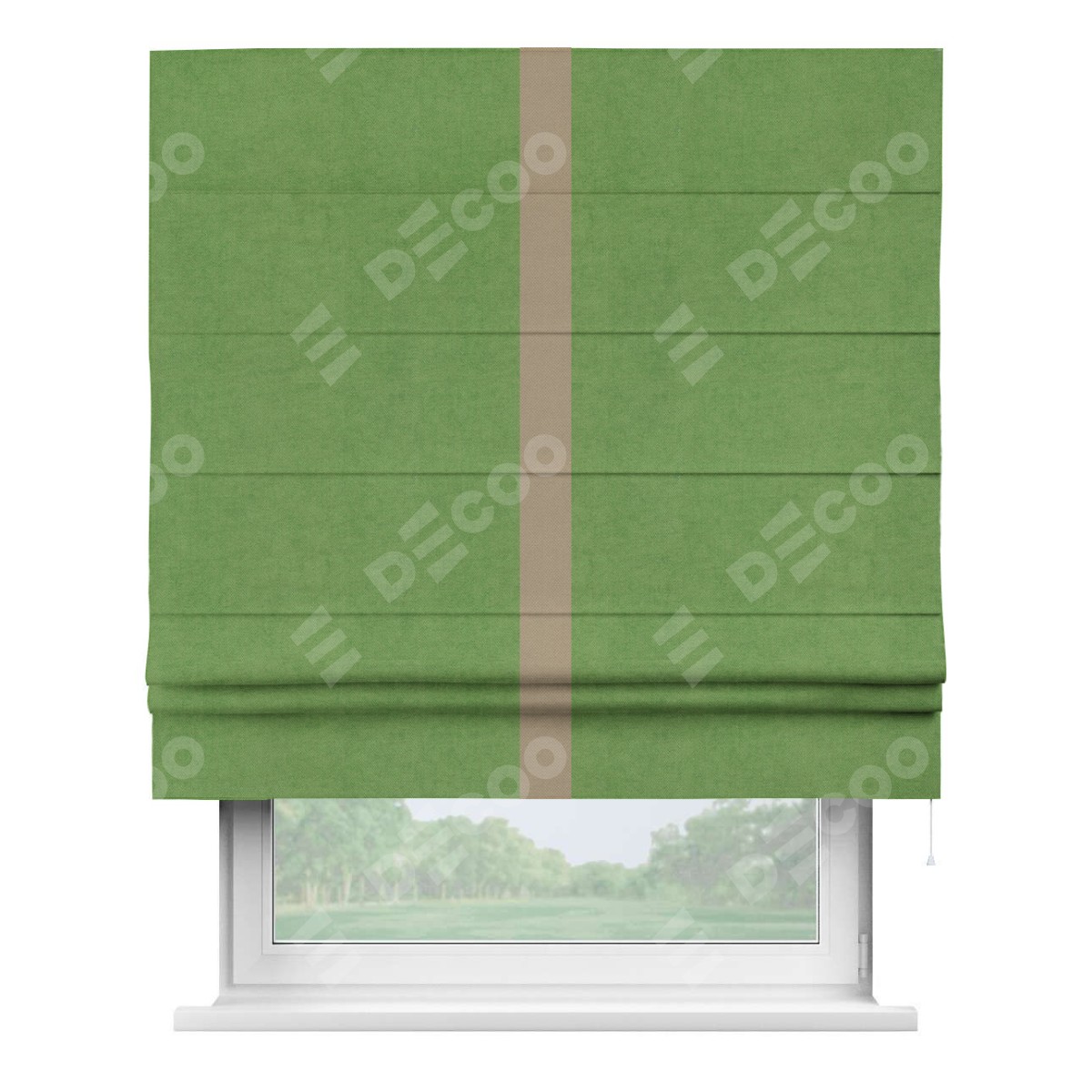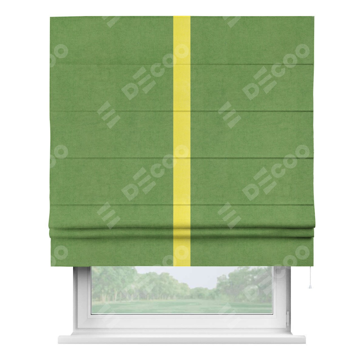 Римская штора производителя «Cortin», используется для проёма, пошита из ткани вельвет салатовый, артикул ткани 87072. Отделка шторы кантом «Хайвей», ткань для канта используется из вельвета разной расцветки на выбор. Имеет универсальный механизм и подходит для монтажа: на потолок, на стену и в нишу.