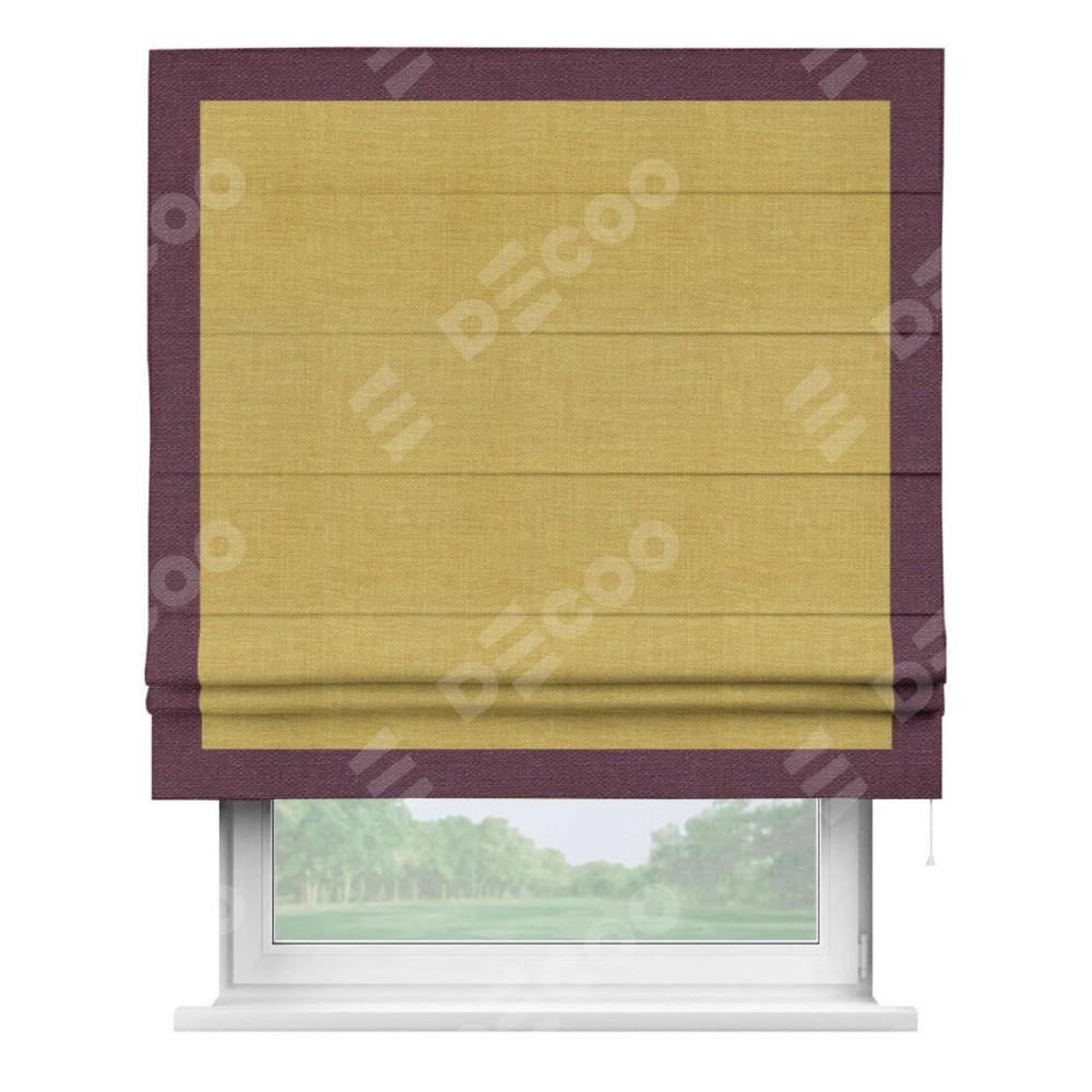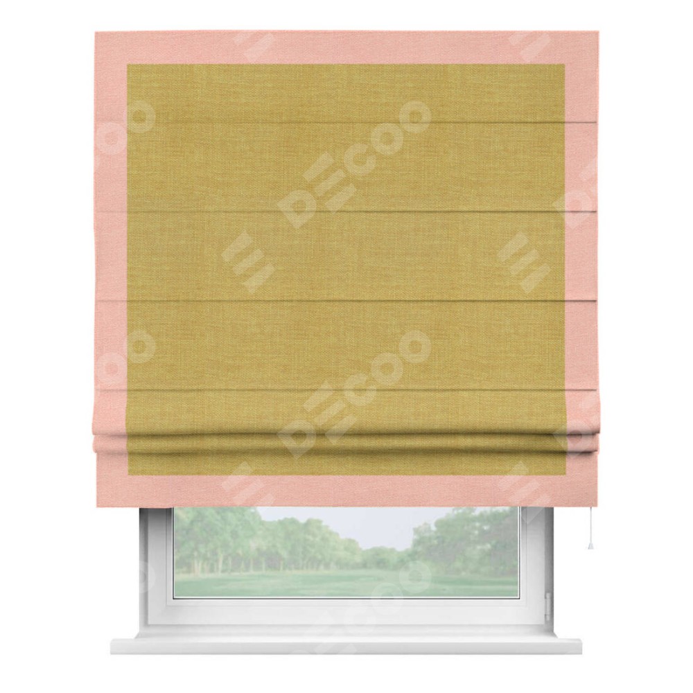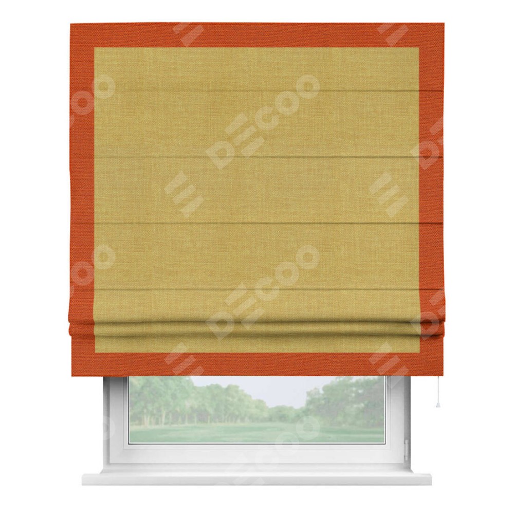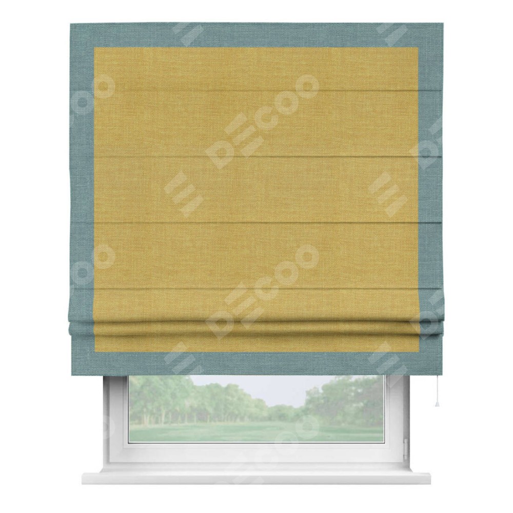 Римская штора производителя «Cortin», используется для проёма, пошита из ткани лён горчичный, артикул 74740. Отделка шторы кантом «Чесс», ткань для канта используется из льна разной расцветки на выбор. Имеет универсальный механизм и подходит для монтажа: на потолок, на стену и в нишу.