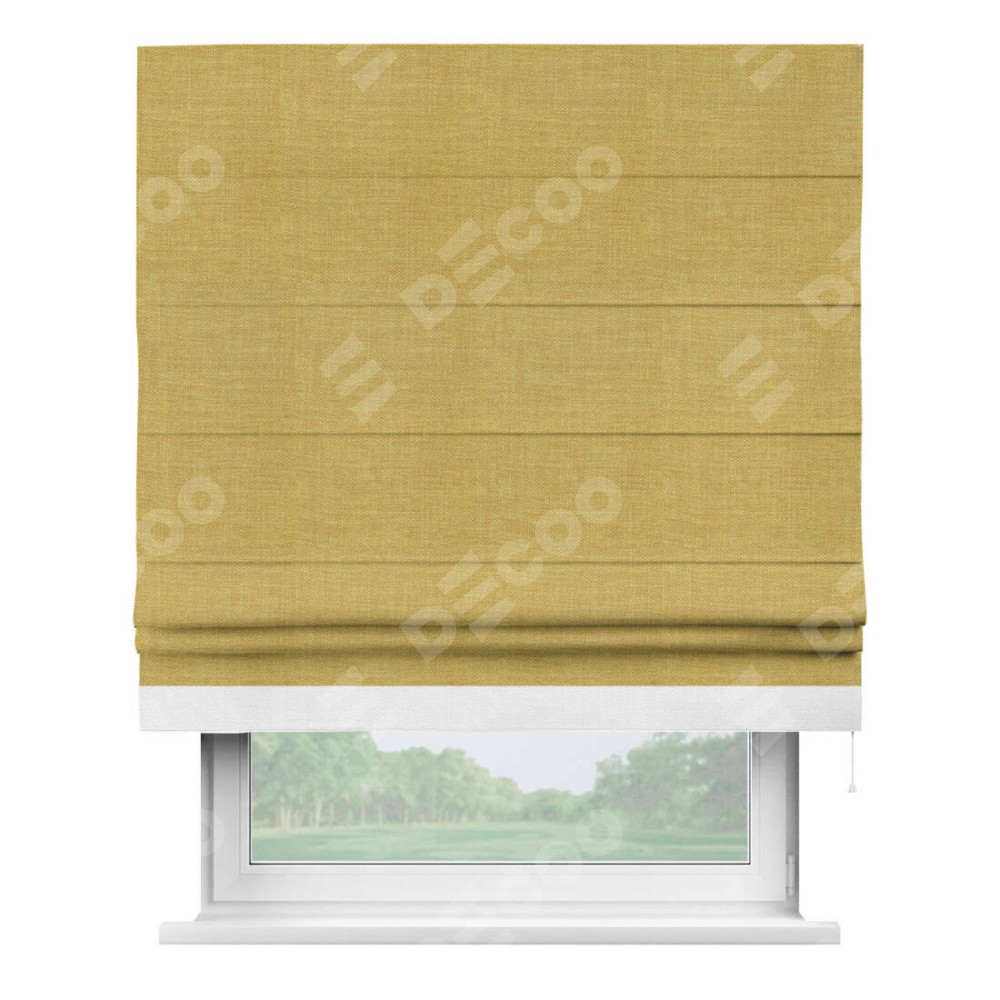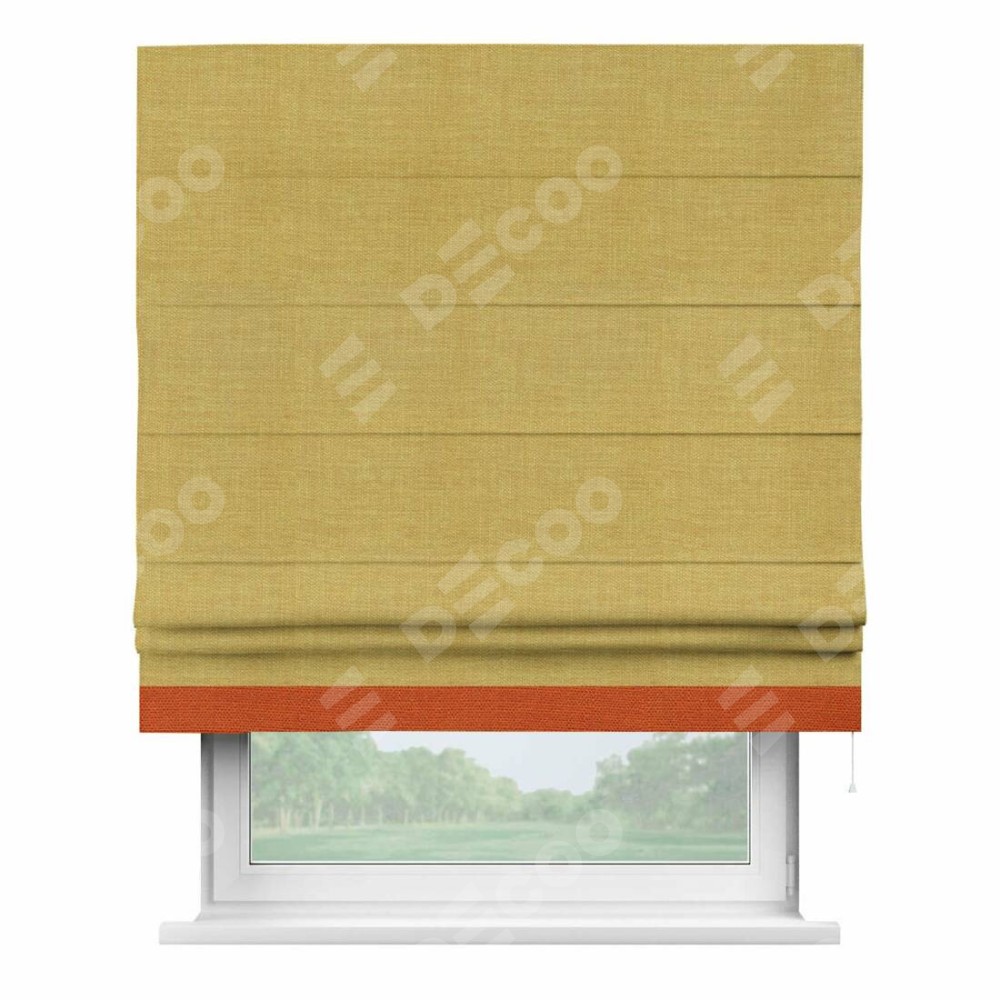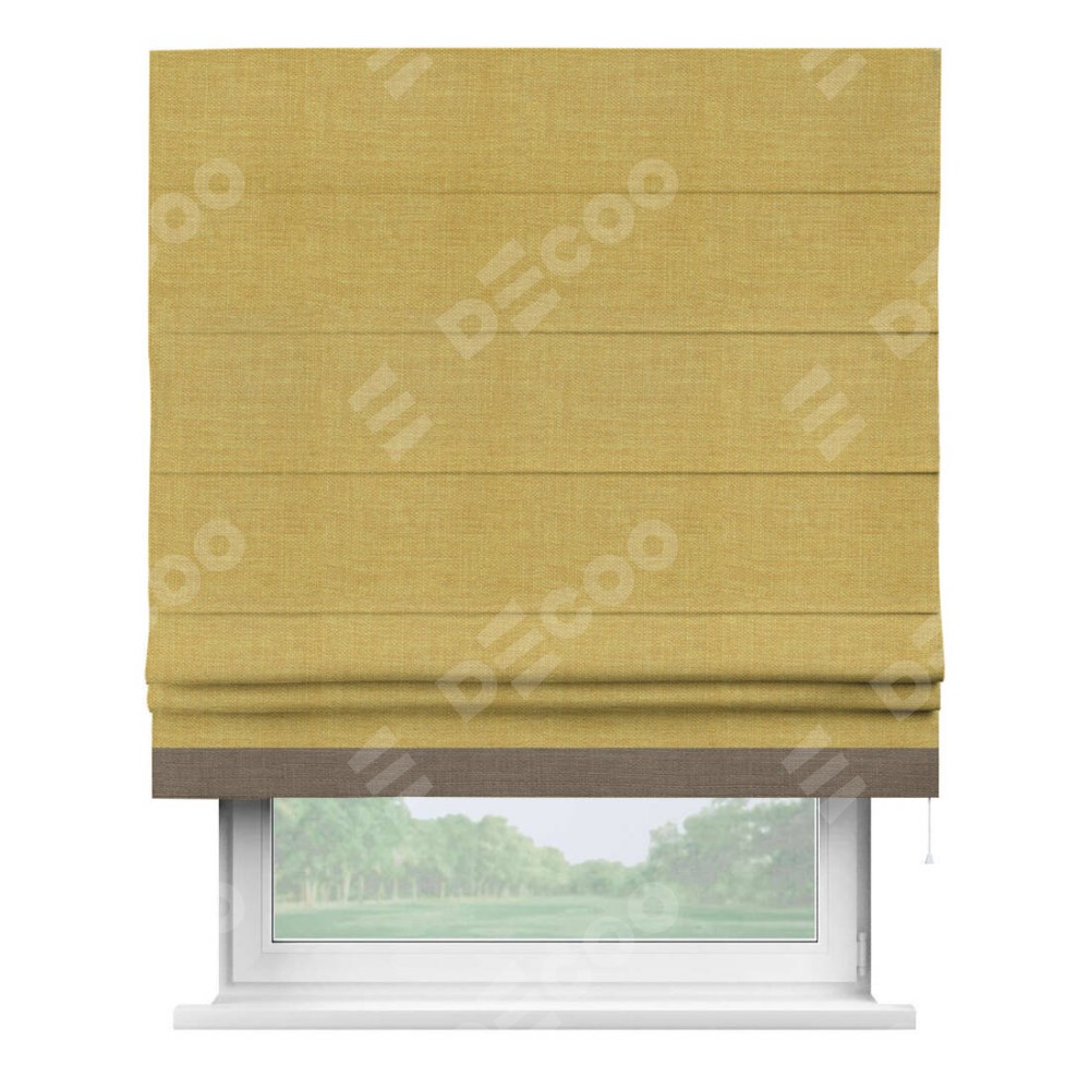 Римская штора производителя «Cortin», используется для проёма, пошита из ткани лён горчичный, артикул 74740. Отделка шторы кантом «Джестер», ткань для канта используется из льна разной расцветки на выбор. Имеет универсальный механизм и подходит для монтажа: на потолок, на стену и в нишу.