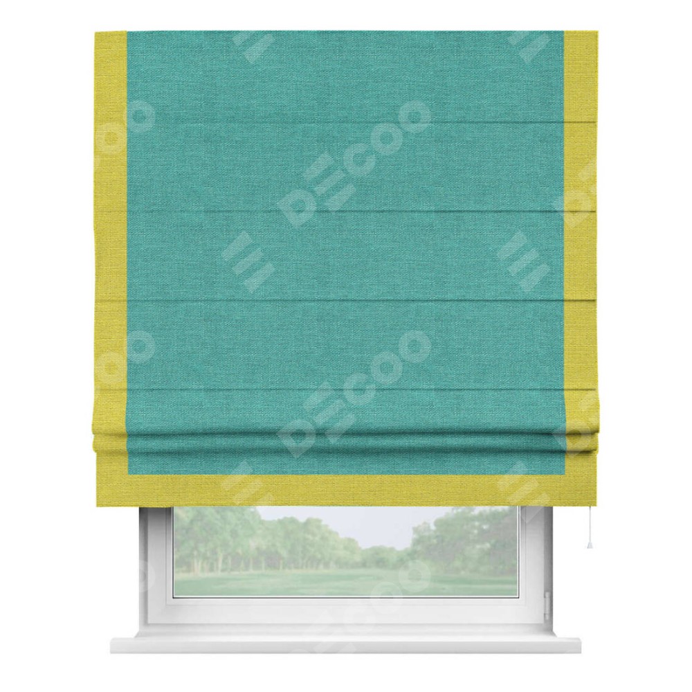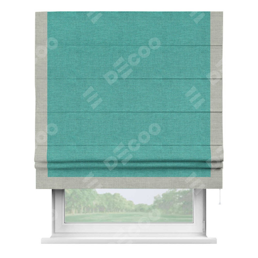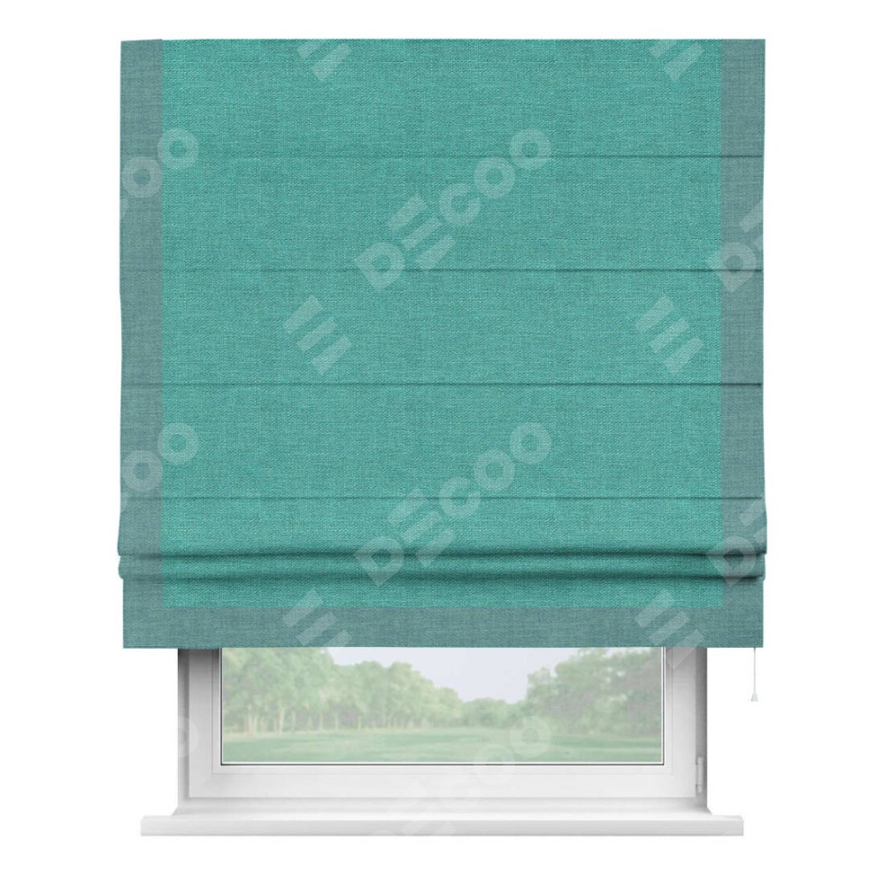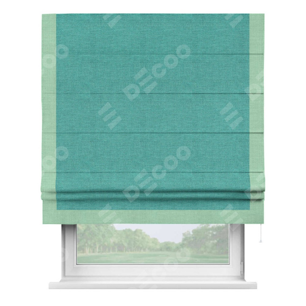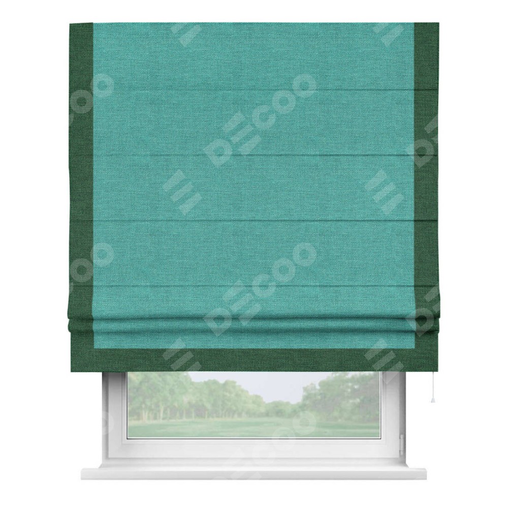 Римская штора производителя «Cortin», используется для проёма, пошита из ткани лён изумрудный, артикул 85908. Отделка шторы кантом «Виктория», ткань для канта используется из льна разной расцветки на выбор. Имеет универсальный механизм и подходит для монтажа: на потолок, на стену и в нишу.