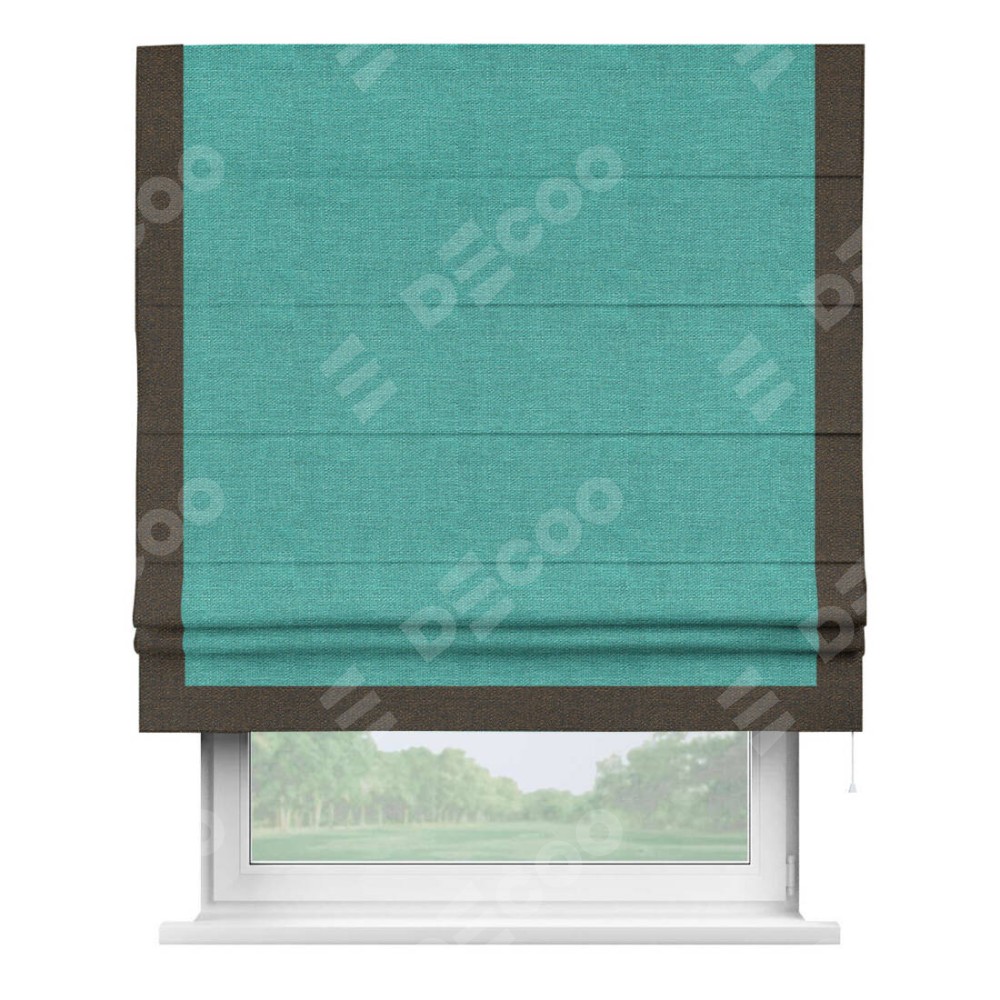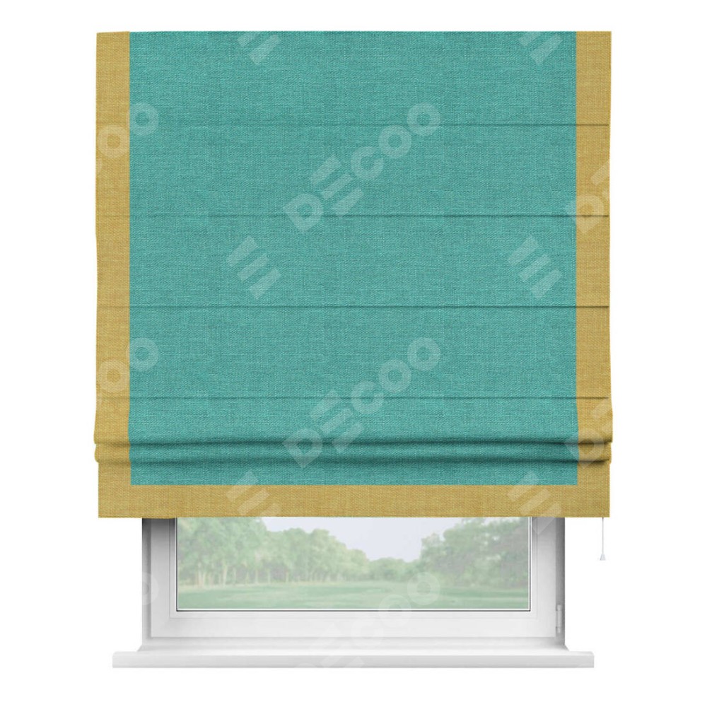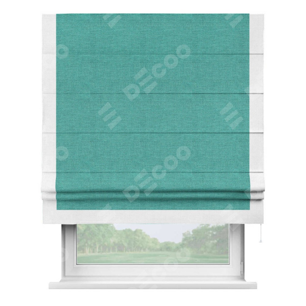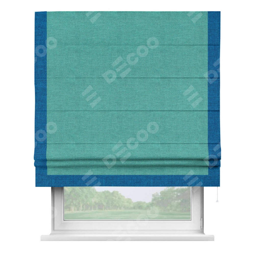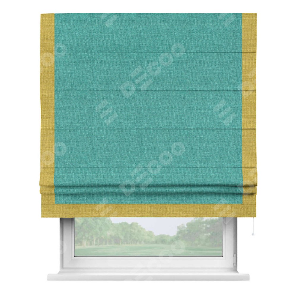 Римская штора производителя «Cortin», используется для проёма, пошита из ткани лён изумрудный, артикул 85908. Отделка шторы кантом «Виктория», ткань для канта используется из льна разной расцветки на выбор. Имеет универсальный механизм и подходит для монтажа: на потолок, на стену и в нишу.