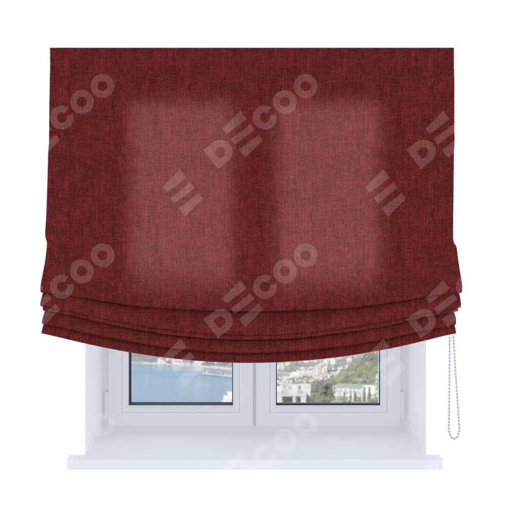 Римская штора Soft производителя «Cortin», используется для проёма, пошита из ткани лён кашемир бордовый, артикул ткани 17213. Имеет универсальный механизм и подходит для монтажа: на потолок, на стену и в нишу. В отличие от стандартных римских штор, римская штора Soft не имеет горизонтальных вставок и нижнего отвеса. Это позволяет ткани произвольно драпироваться в свободные мягкие складки.