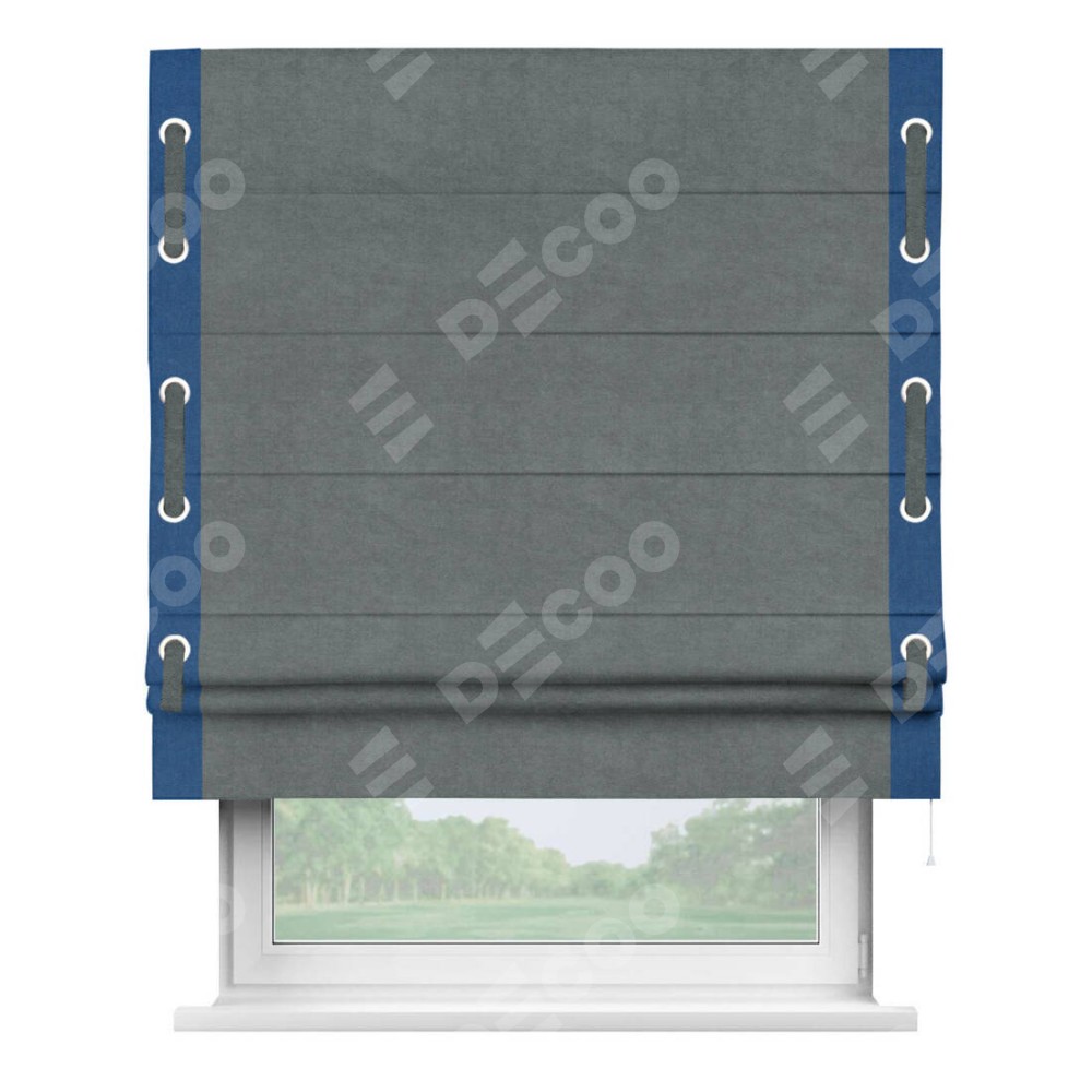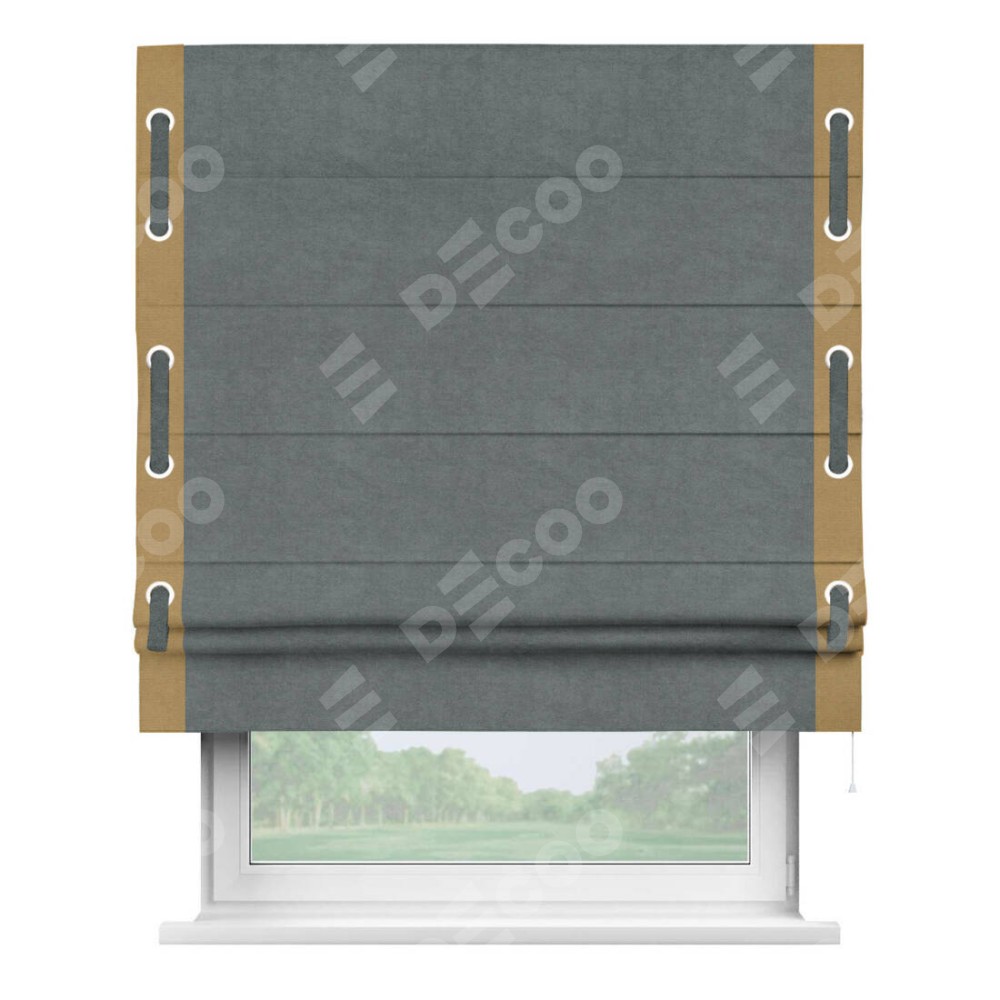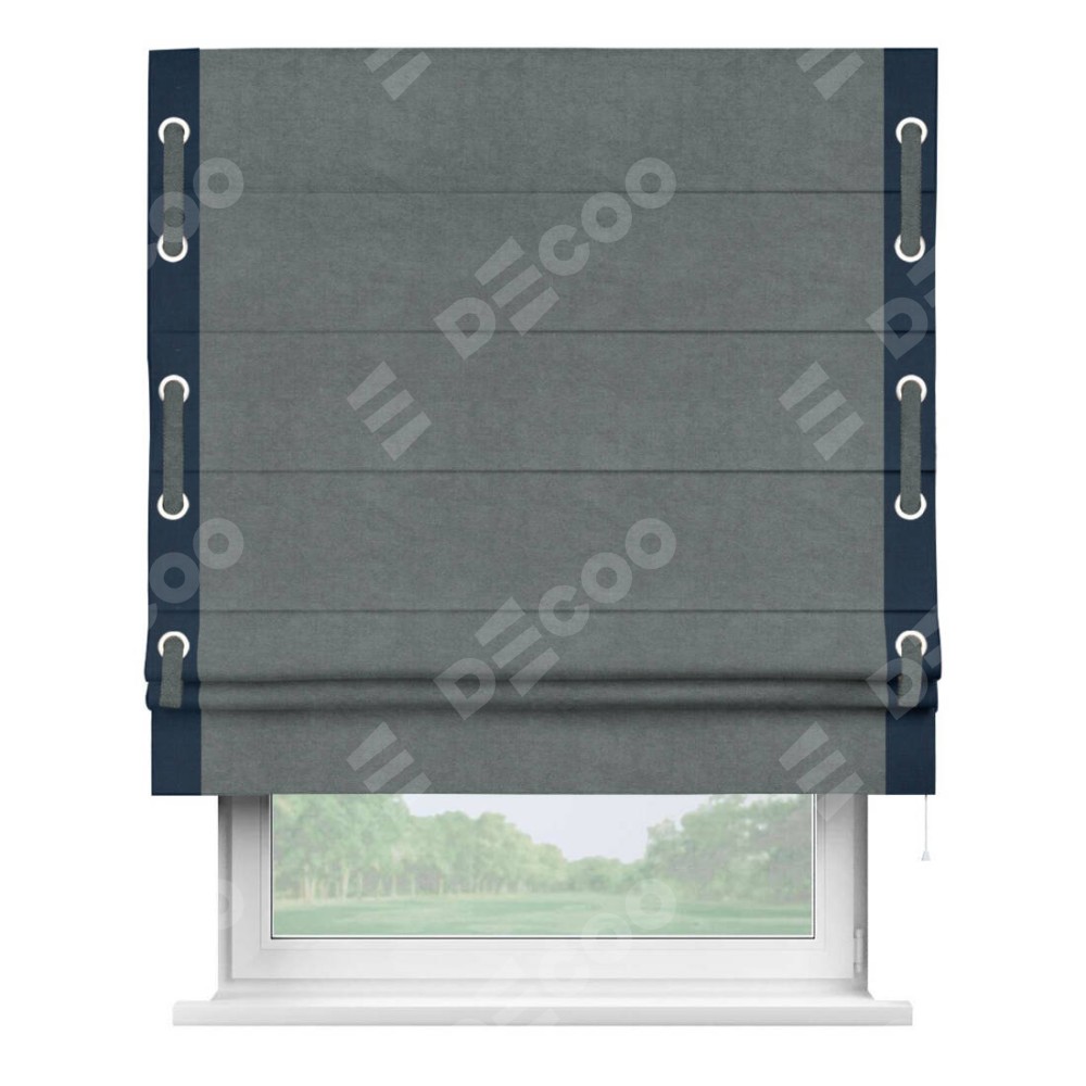 Римская штора производителя «Cortin», используется для проёма, пошита из ткани вельвет серый, артикул ткани 85542. Отделка шторы кантом «Стрим Дуо» на кантах расположены люверсы с пояском, ткань для канта используется из вельвета разной расцветки на выбор. Ткань для пояска обычно используется из основной ткани шторы, а так же можно сделать из любой расцветки по желанию. Имеет универсальный механизм и подходит для монтажа: на потолок, на стену и в нишу.