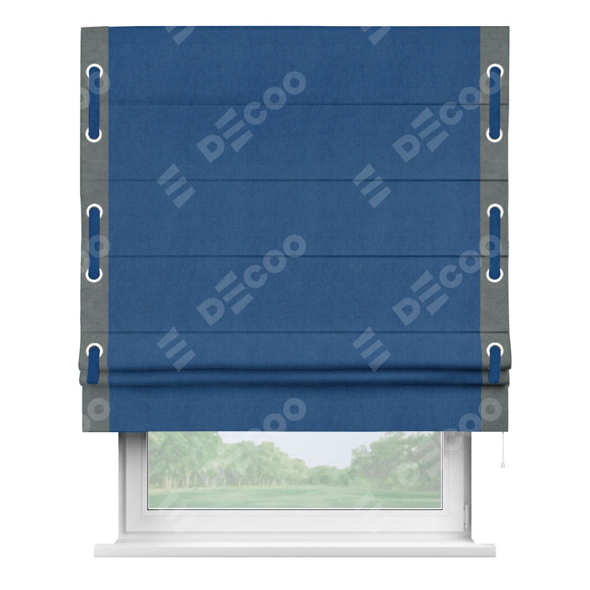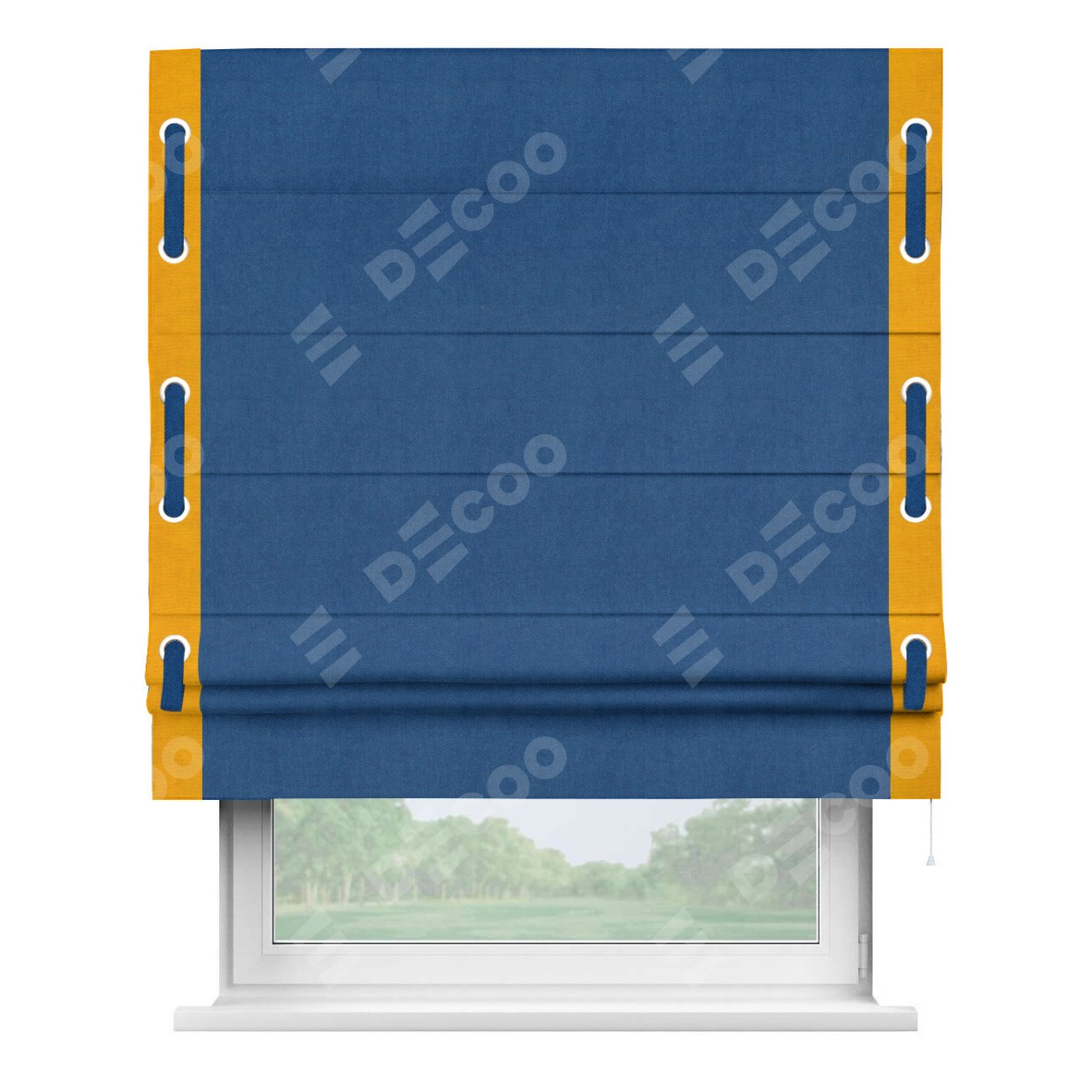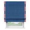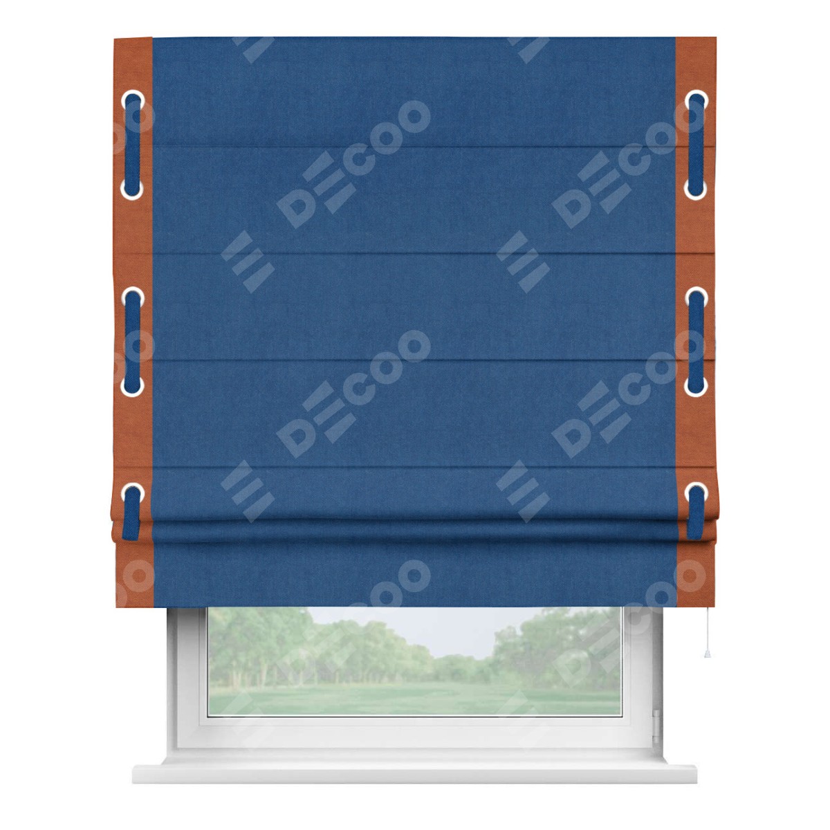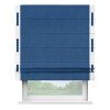 Римская штора производителя «Cortin», используется для проёма, пошита из ткани вельвет синий, артикул ткани 85554. Отделка шторы кантом «Стрим Дуо» на кантах расположены люверсы с пояском, ткань для канта используется из вельвета разной расцветки на выбор. Ткань для пояска обычно используется из основной ткани шторы, а так же можно сделать из любой расцветки по желанию. Имеет универсальный механизм и подходит для монтажа: на потолок, на стену и в нишу.