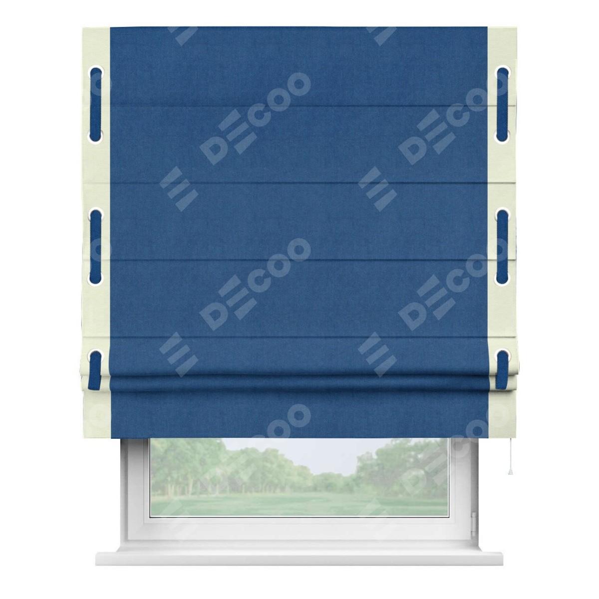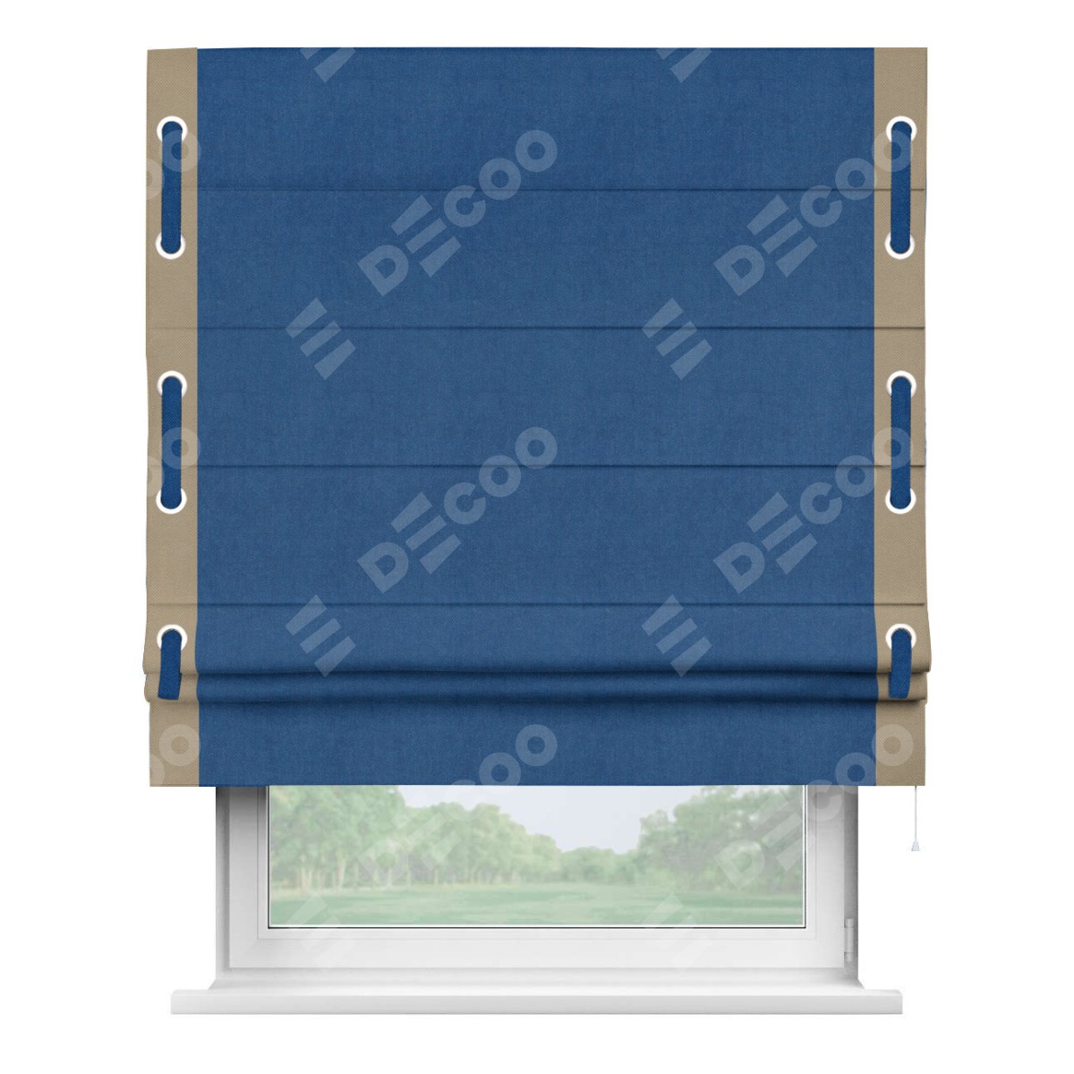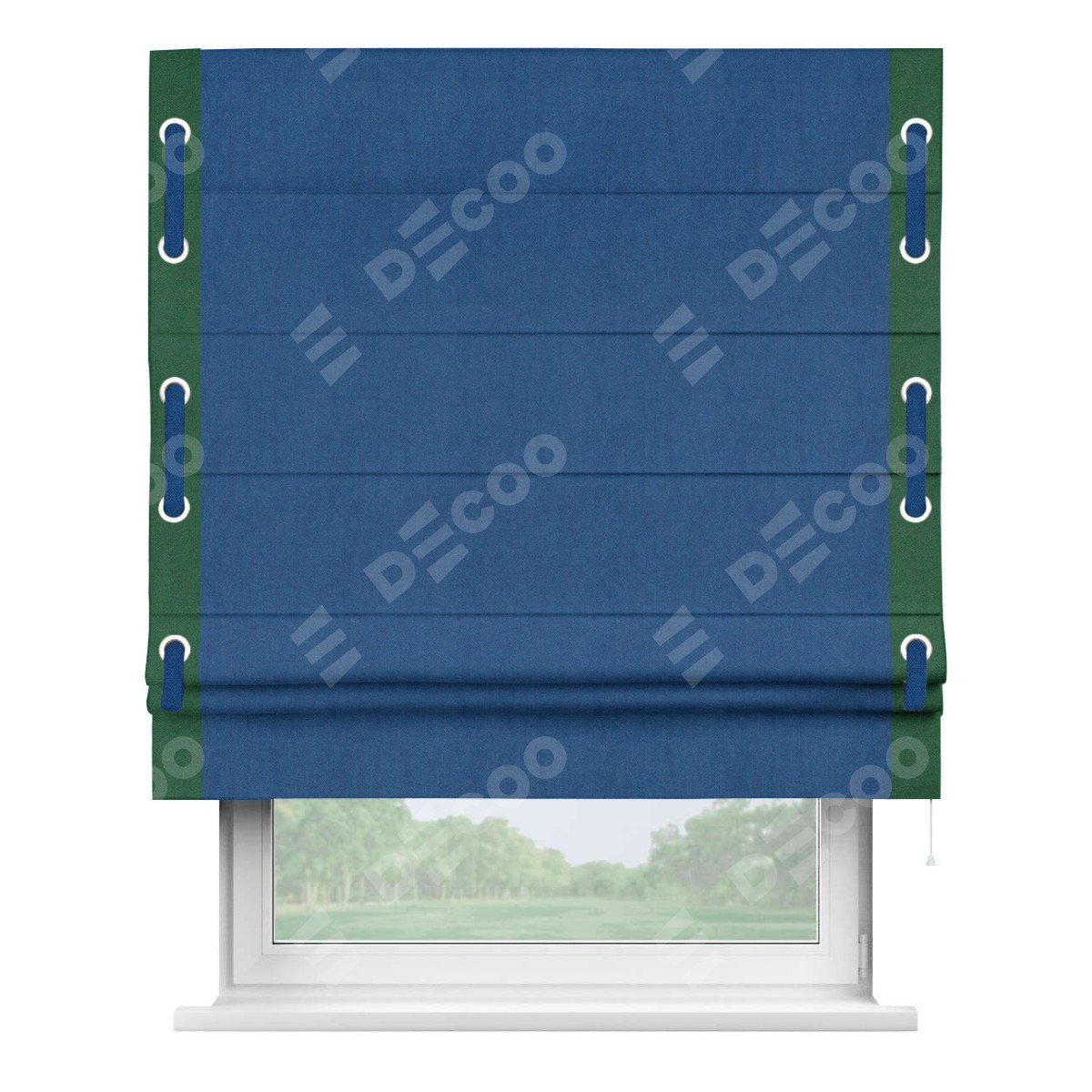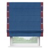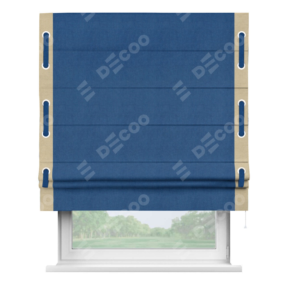 Римская штора производителя «Cortin», используется для проёма, пошита из ткани вельвет синий, артикул ткани 85554. Отделка шторы кантом «Стрим Дуо» на кантах расположены люверсы с пояском, ткань для канта используется из вельвета разной расцветки на выбор. Ткань для пояска обычно используется из основной ткани шторы, а так же можно сделать из любой расцветки по желанию. Имеет универсальный механизм и подходит для монтажа: на потолок, на стену и в нишу.