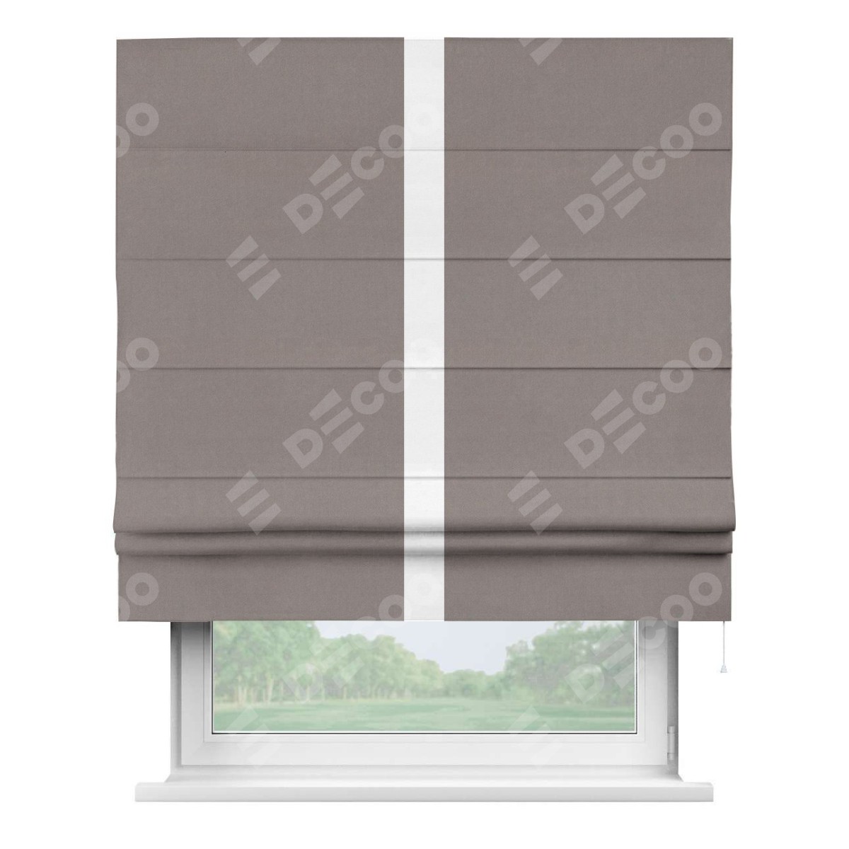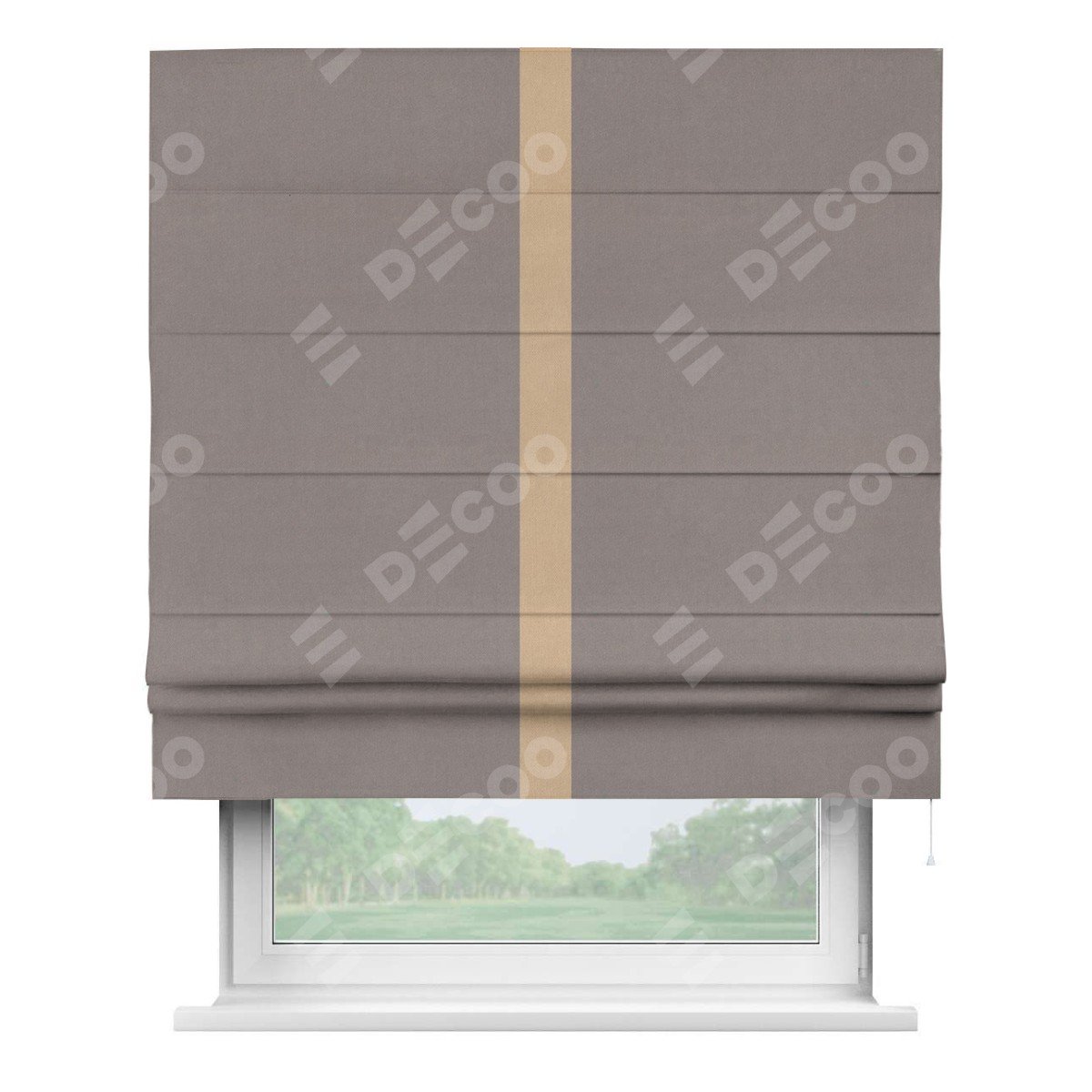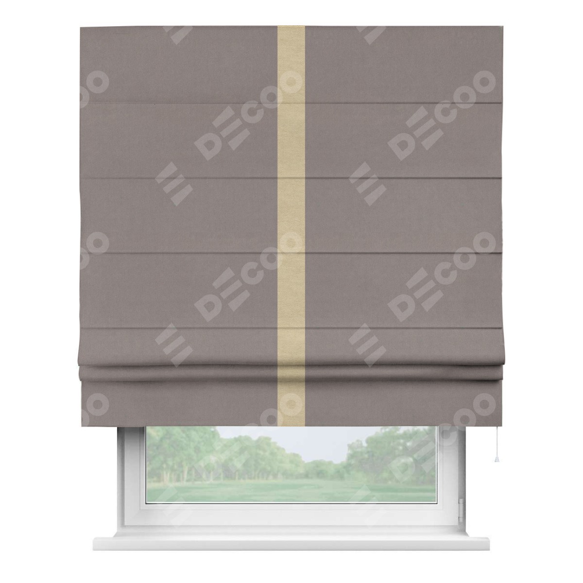 Римская штора производителя «Cortin», используется для проёма, пошита из ткани вельвет темно-бежевый, артикул ткани 82527. Отделка шторы кантом «Хайвей», ткань для канта используется из вельвета разной расцветки на выбор. Имеет универсальный механизм и подходит для монтажа: на потолок, на стену и в нишу.