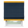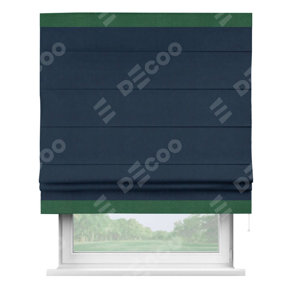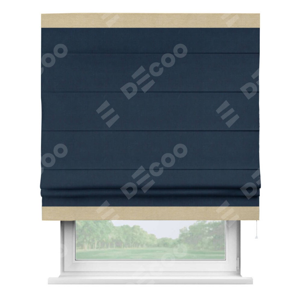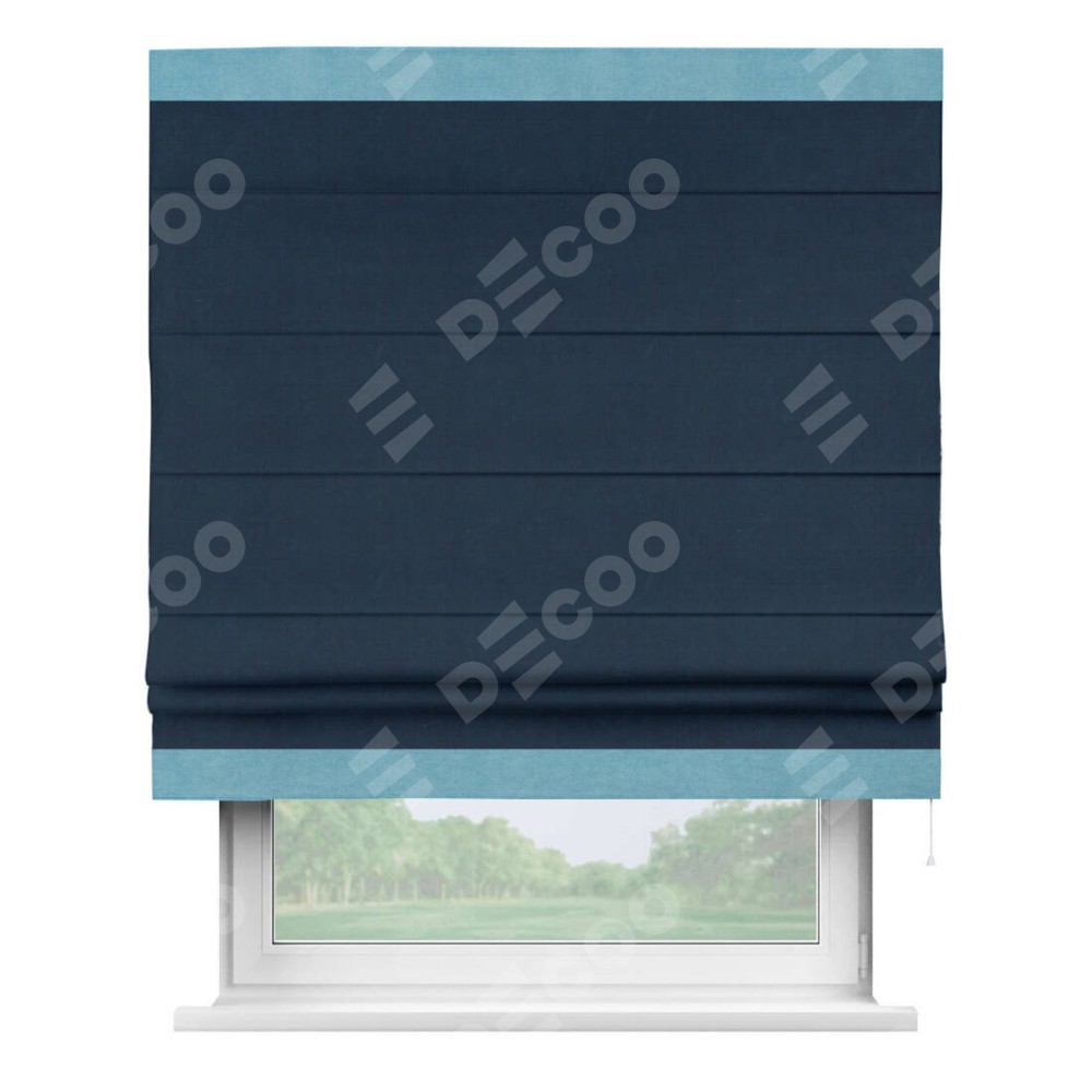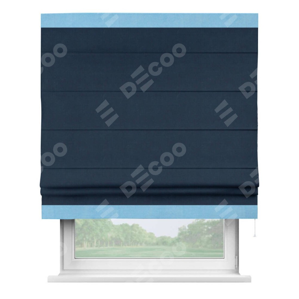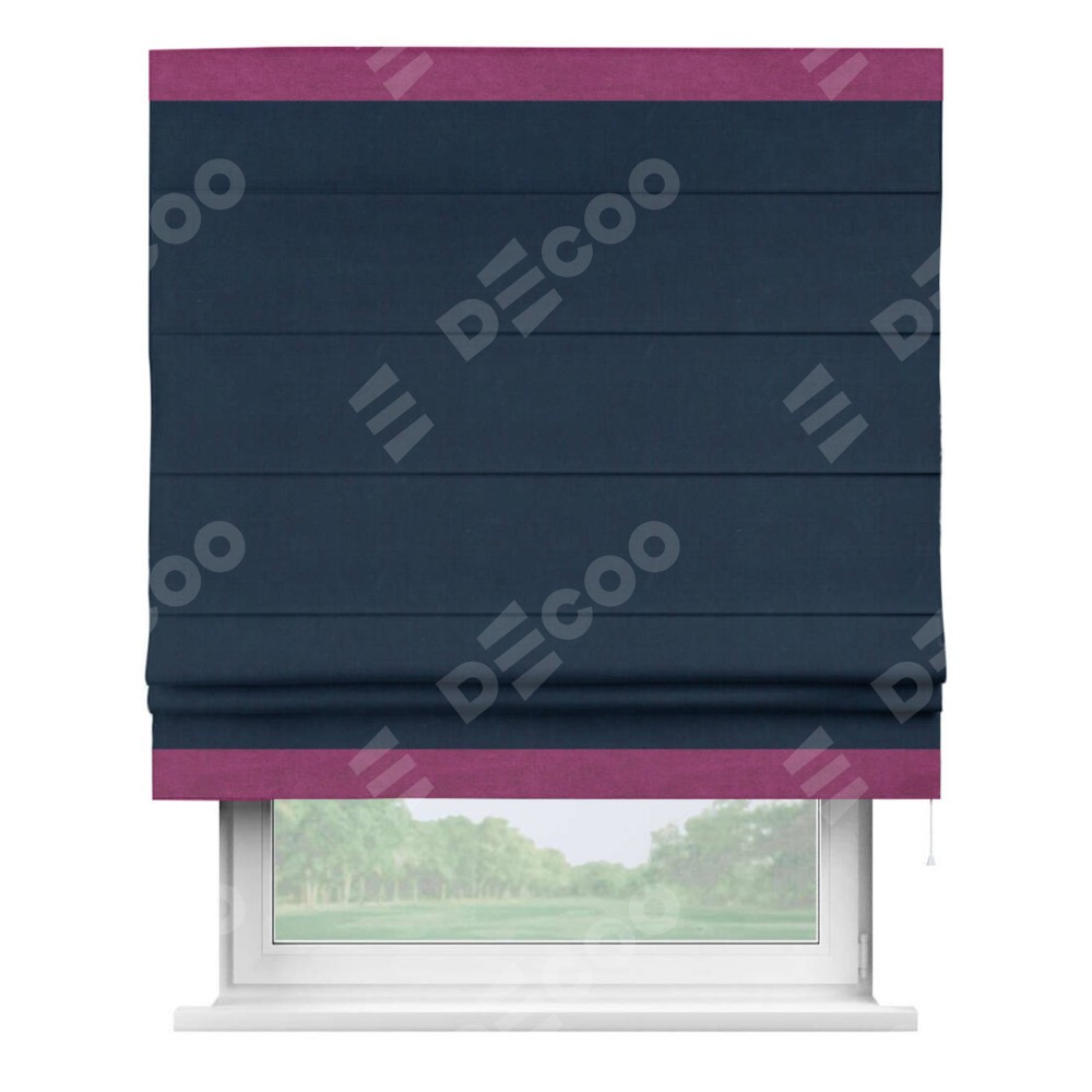Римская штора производителя «Cortin», используется для проёма, пошита из ткани вельвет темно-синий, артикул ткани 14152. Отделка шторы кантом «Горизонт», ткань для канта используется из вельвета разной расцветки на выбор. Имеет универсальный механизм и подходит для монтажа: на потолок, на стену и в нишу.