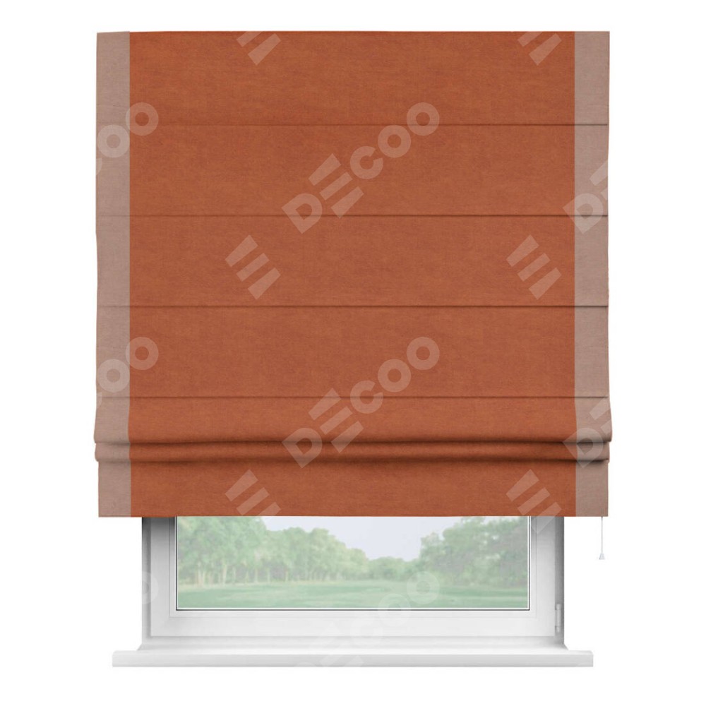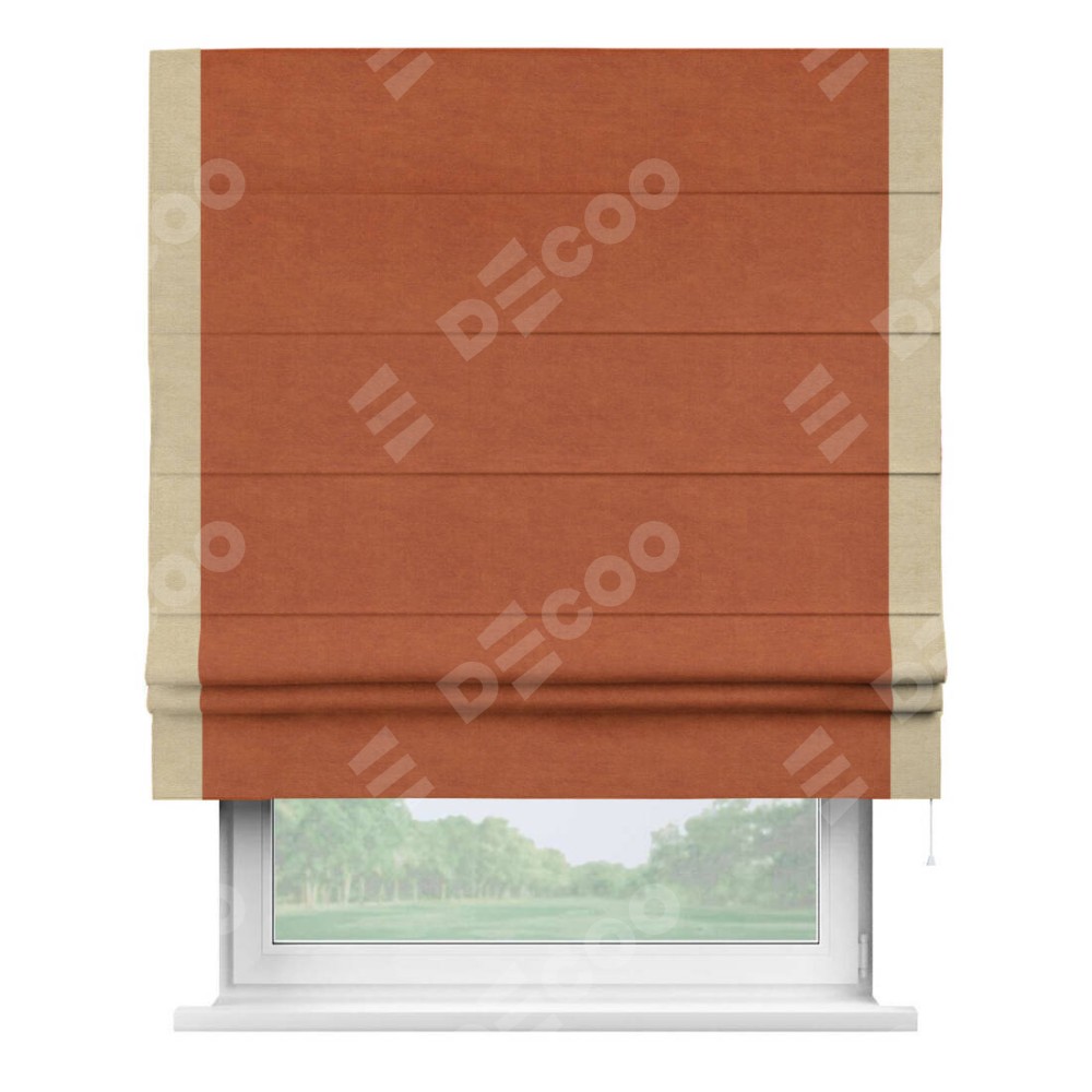 Римская штора производителя «Cortin», используется для проёма, пошита из ткани вельвет терракотовый, артикул ткани 85548. Отделка шторы кантом «Стрим Дуо», ткань для канта используется из вельвета разной расцветки на выбор. Имеет универсальный механизм и подходит для монтажа: на потолок, на стену и в нишу.
