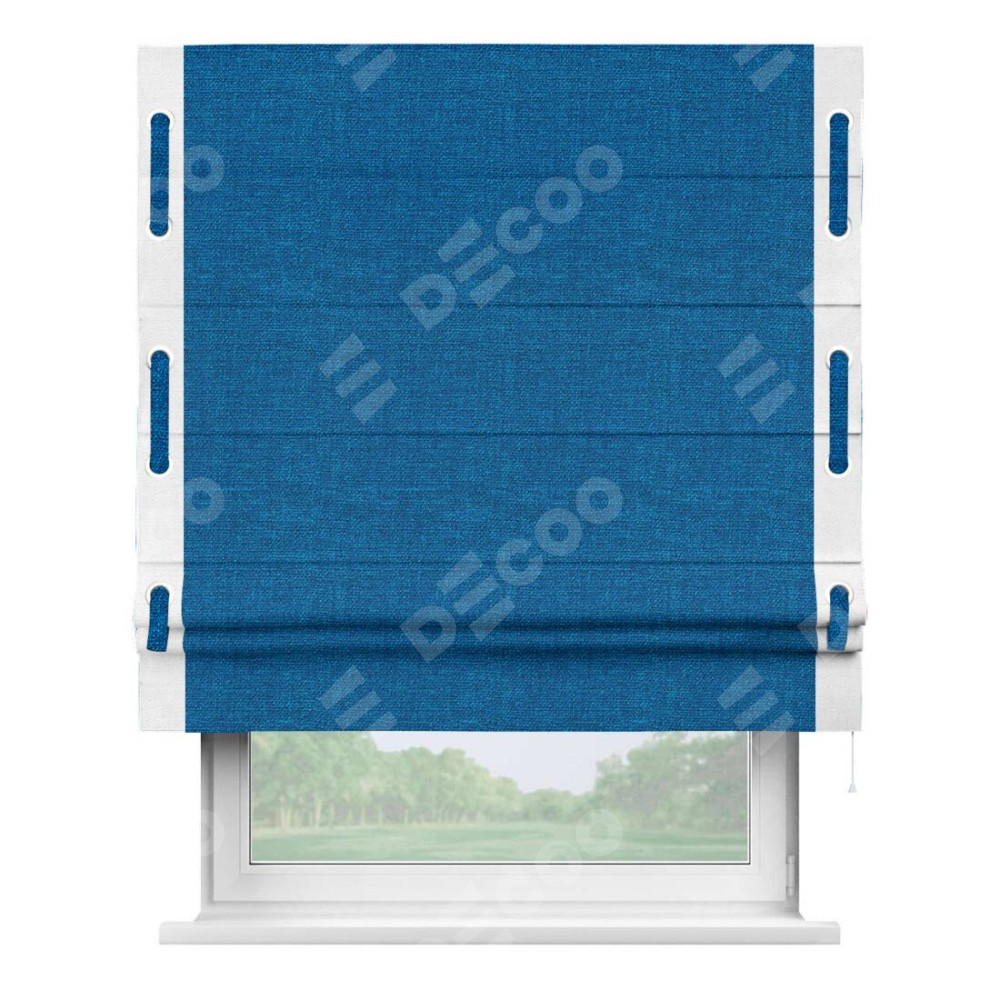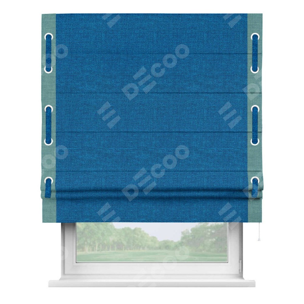 Римская штора производителя «Cortin», используется для проёма, пошита из ткани лён синий, артикул 63742. Отделка шторы кантом «Стрим Дуо» на кантах расположены люверсы с пояском, ткань для канта используется из льна разной расцветки на выбор. Ткань для пояска обычно используется из основной ткани шторы, а так же можно сделать из любой расцветки по желанию. Имеет универсальный механизм и подходит для монтажа: на потолок, на стену и в нишу.