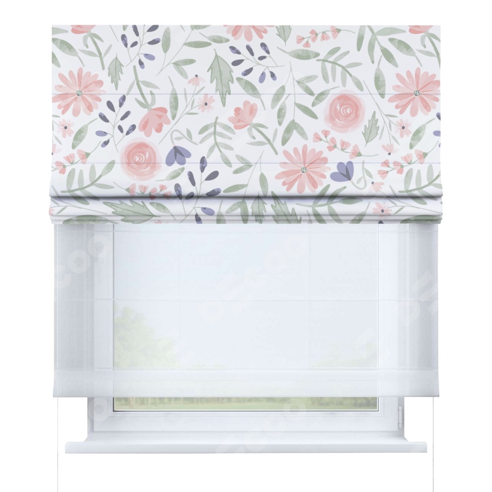 Римская штора день-ночь производителя «Cortin», используется для проёма, пошита из двух полотен, с лицевой блэкаут с нанесением сублимационной печати «Изысканные цветы», вторая ткань тюль (по стандарту комплектуется тюль белого цвета артикул V-01). Имеет универсальный механизм и подходит для монтажа: на потолок, на стену и в нишу.