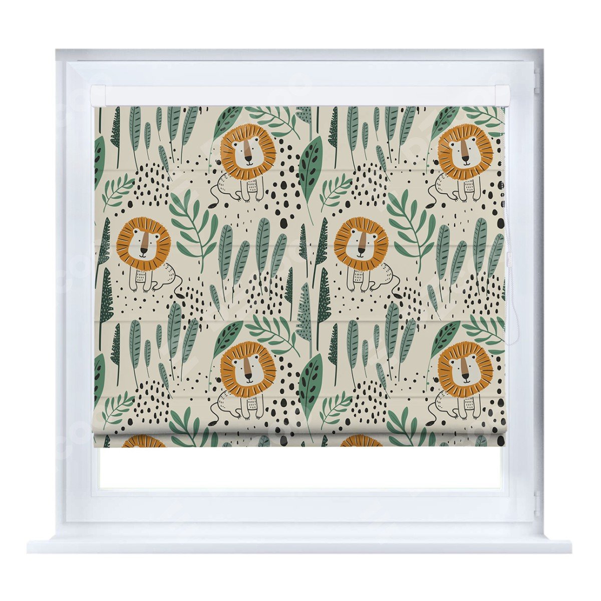 Римская штора кассетного типа, производителя «Cortin», устанавливается только на пластиковые окна и прилегает к стеклопакету, пошита из ткани блэкаут с нанесением сублимационной печати «Лев из джунглей».