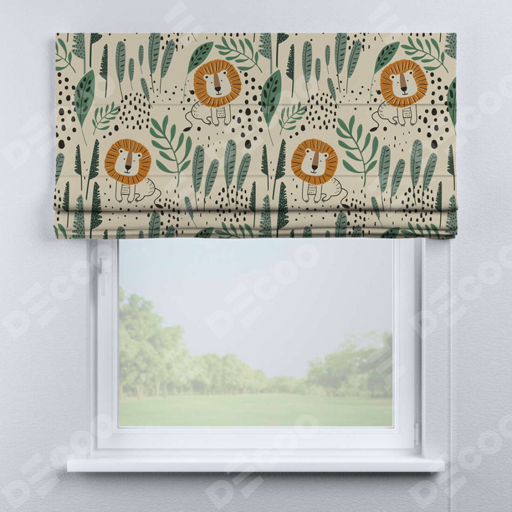 Римская штора производителя «Cortin», используется для проёма, пошита из ткани блэкаут с нанесением сублимационной печати «Лев из джунглей». Имеет универсальный механизм и подходит для монтажа: на потолок, на стену и в нишу.