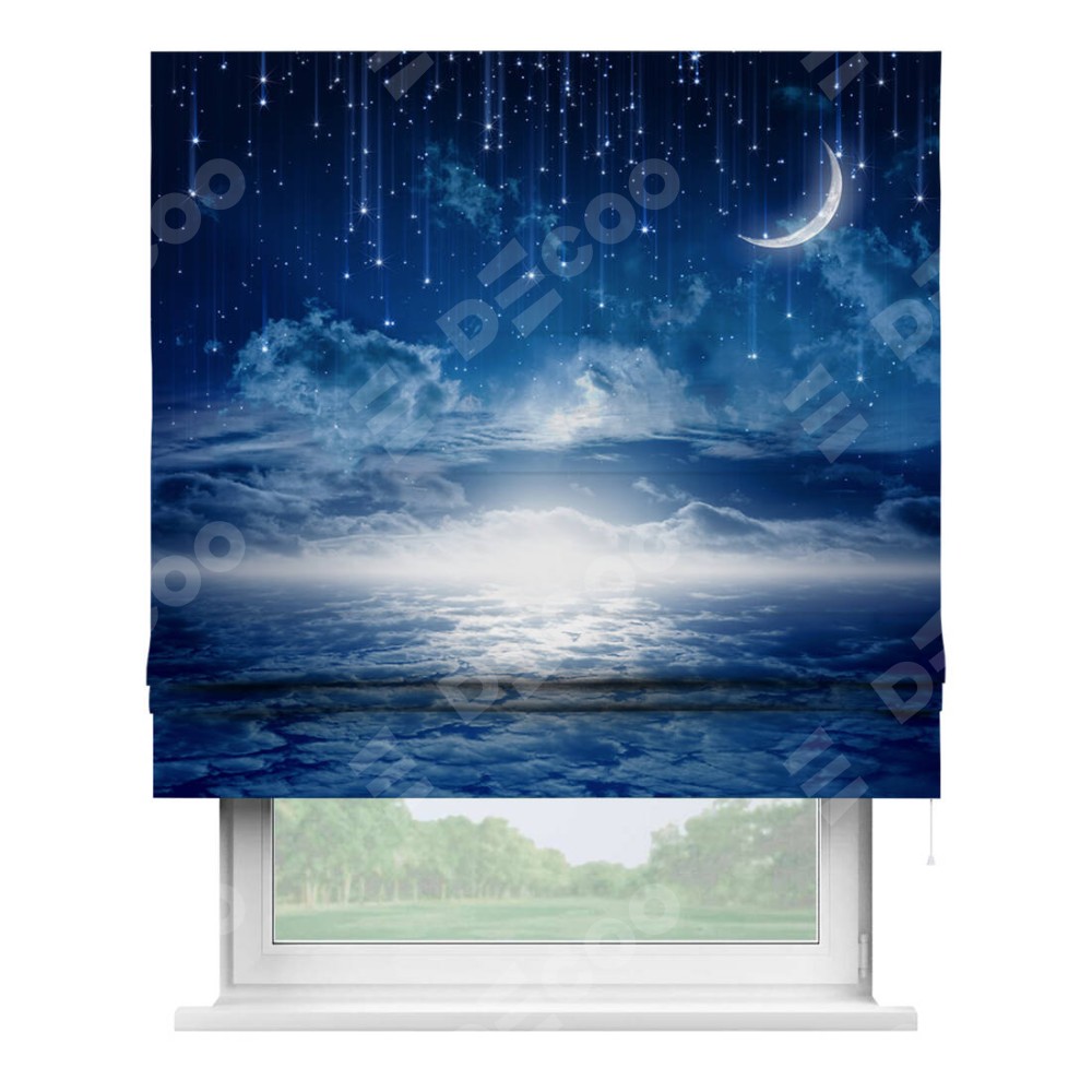 Римская штора производителя «Cortin», используется для проёма, пошита из ткани блэкаут с нанесением сублимационной печати «Ночное небо». Имеет универсальный механизм и подходит для монтажа: на потолок, на стену и в нишу.