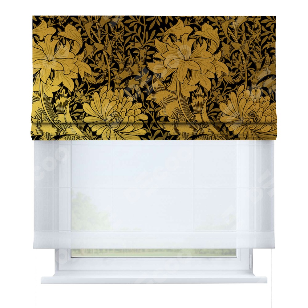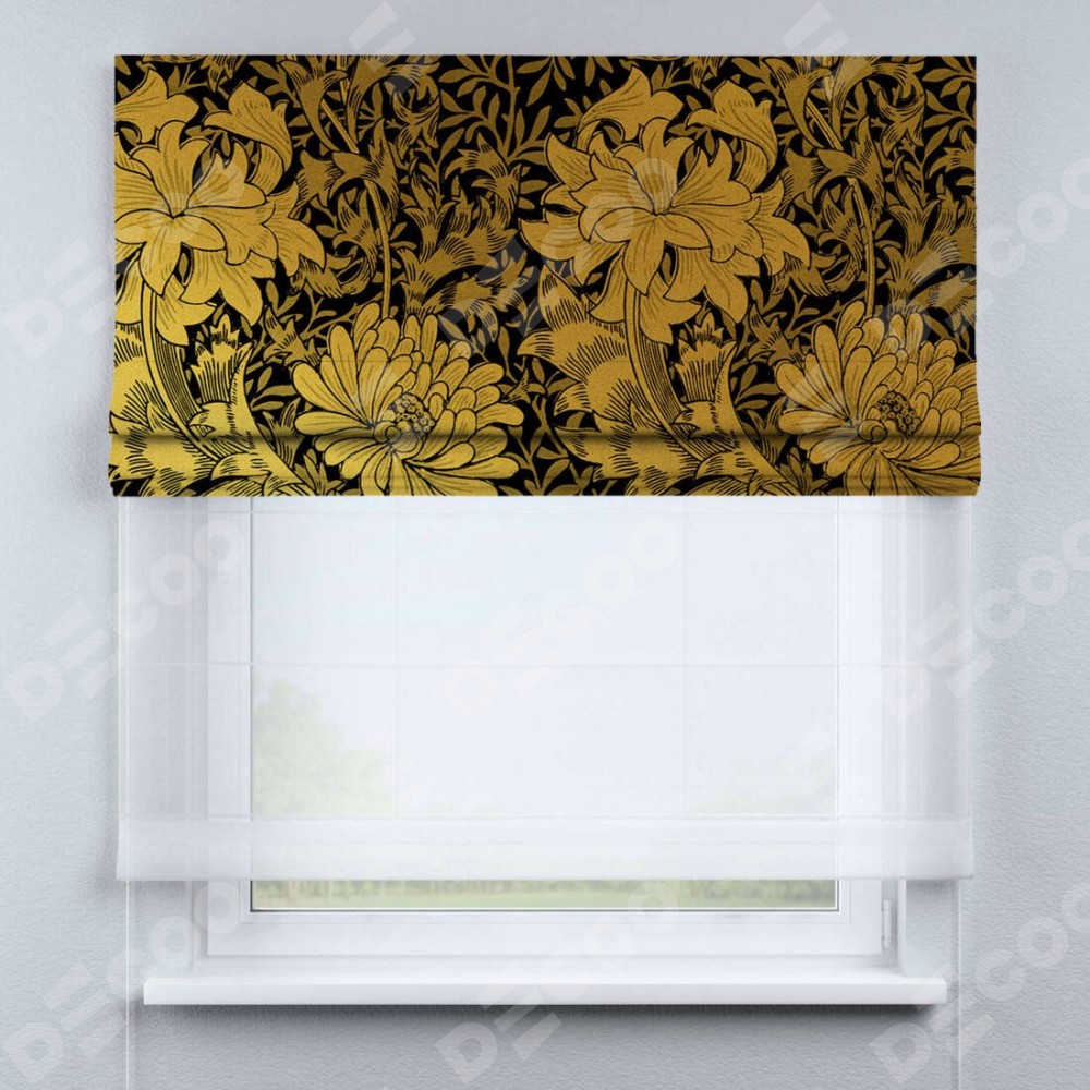 Римская штора день-ночь производителя «Cortin», используется для проёма, пошита из двух полотен, с лицевой блэкаут с нанесением сублимационной печати «Ремикс морриса», вторая ткань тюль (по стандарту комплектуется тюль белого цвета артикул V-01). Имеет универсальный механизм и подходит для монтажа: на потолок, на стену и в нишу.