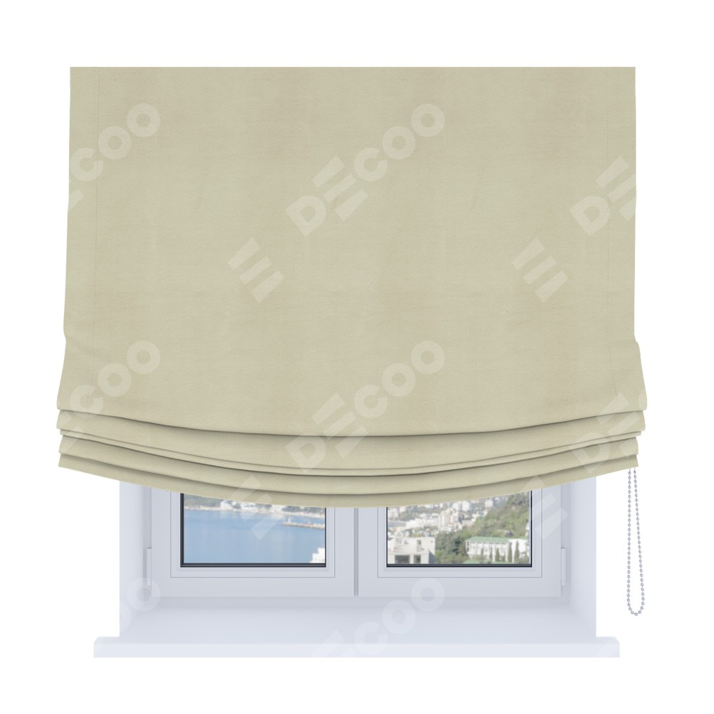 Римская штора Soft производителя «Cortin», используется для проёма, пошита из ткани бархат молочный, артикул ткани 21409. Имеет универсальный механизм и подходит для монтажа: на потолок, на стену и в нишу. В отличие от стандартных римских штор, римская штора Soft не имеет горизонтальных вставок и нижнего отвеса. Это позволяет ткани произвольно драпироваться в свободные мягкие складки.