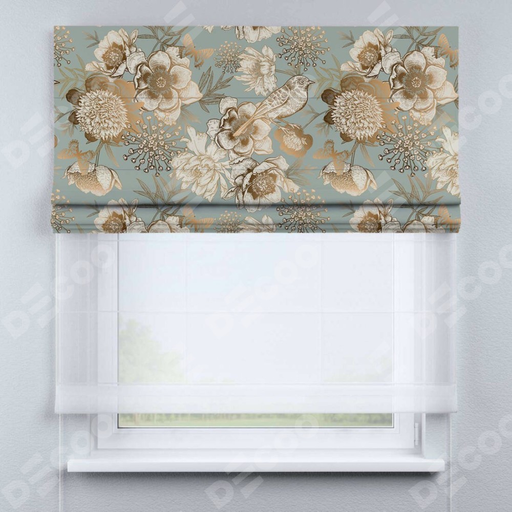 Римская штора день-ночь производителя «Cortin», используется для проёма, пошита из двух полотен, с лицевой блэкаут с нанесением сублимационной печати «Садовые цветы», вторая ткань тюль (по стандарту комплектуется тюль белого цвета артикул V-01). Имеет универсальный механизм и подходит для монтажа: на потолок, на стену и в нишу.