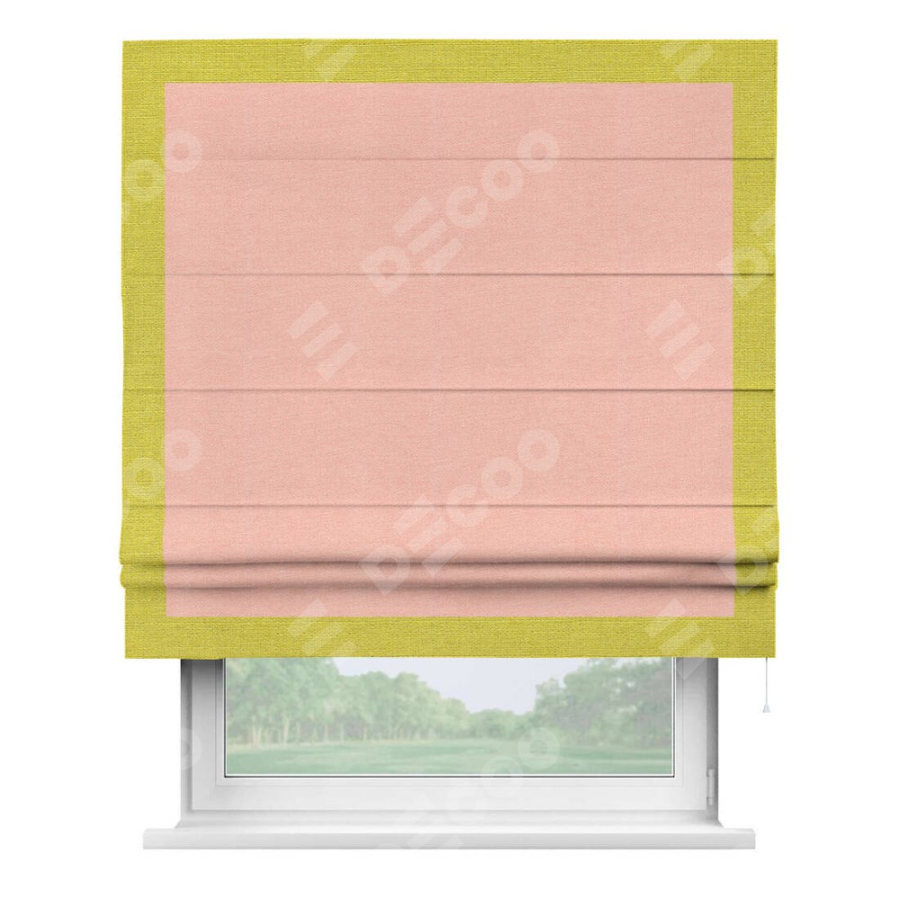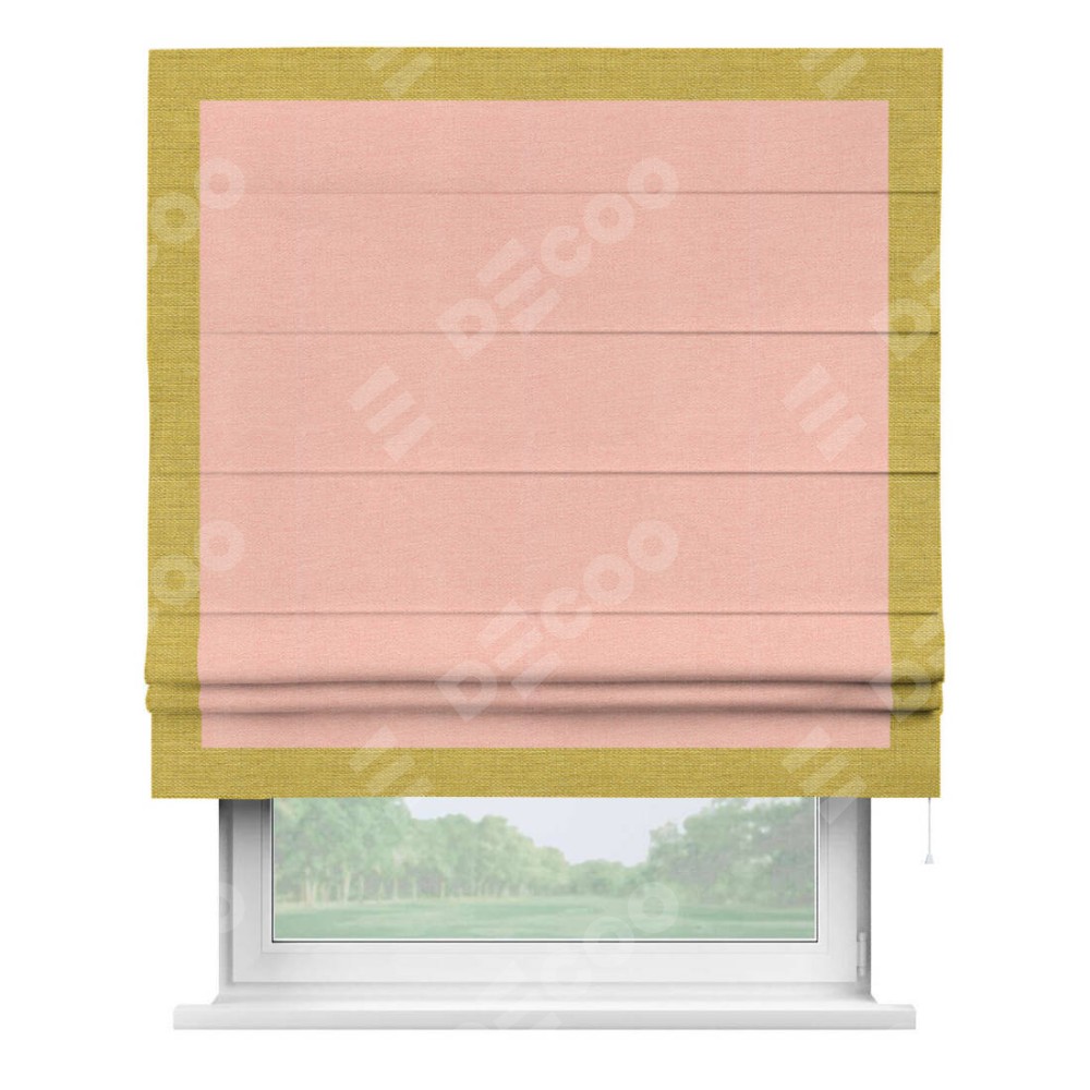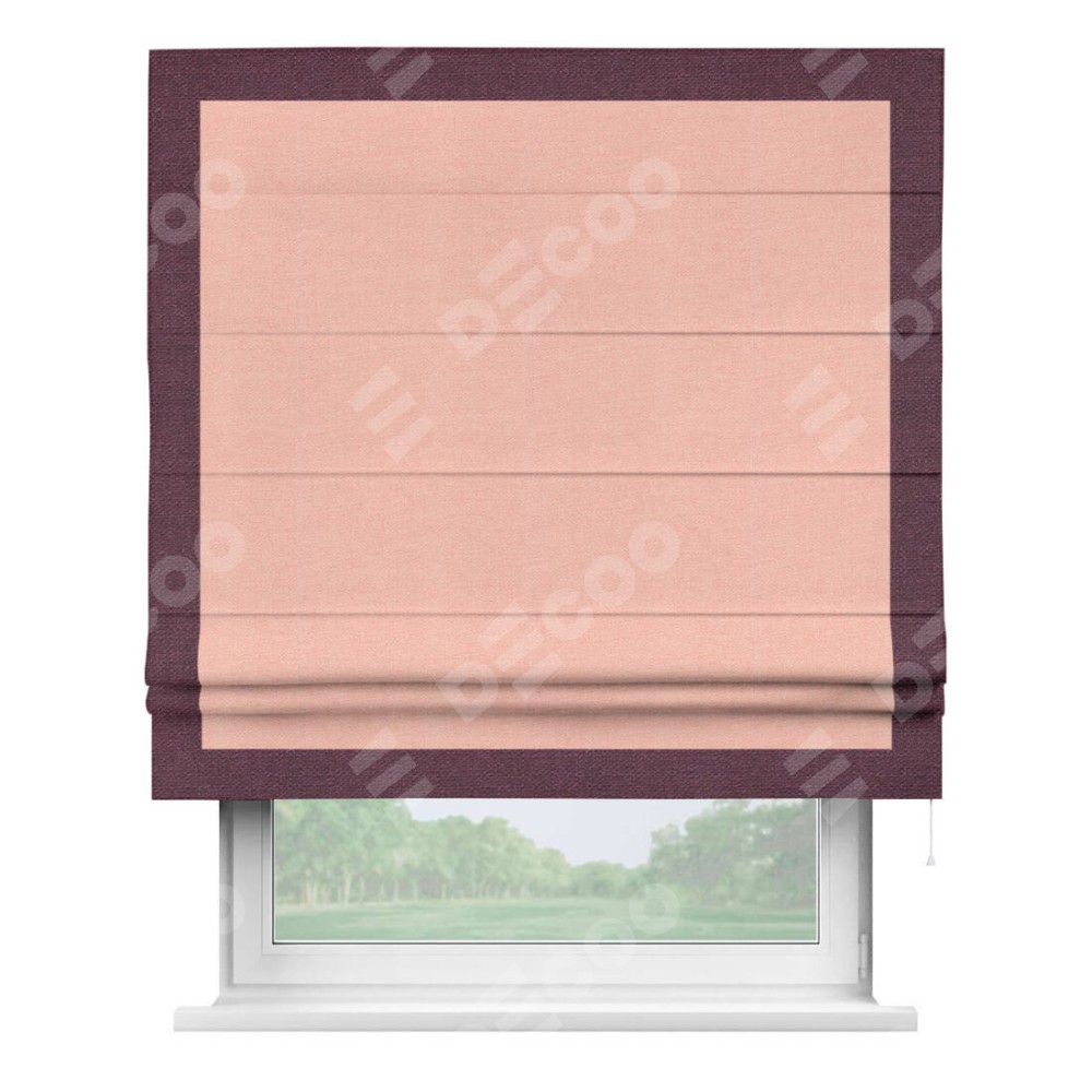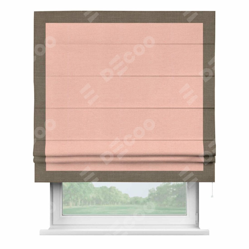 Римская штора производителя «Cortin», используется для проёма, пошита из ткани лён розовый, артикул 00005. Отделка шторы кантом «Чесс», ткань для канта используется из льна разной расцветки на выбор. Имеет универсальный механизм и подходит для монтажа: на потолок, на стену и в нишу.