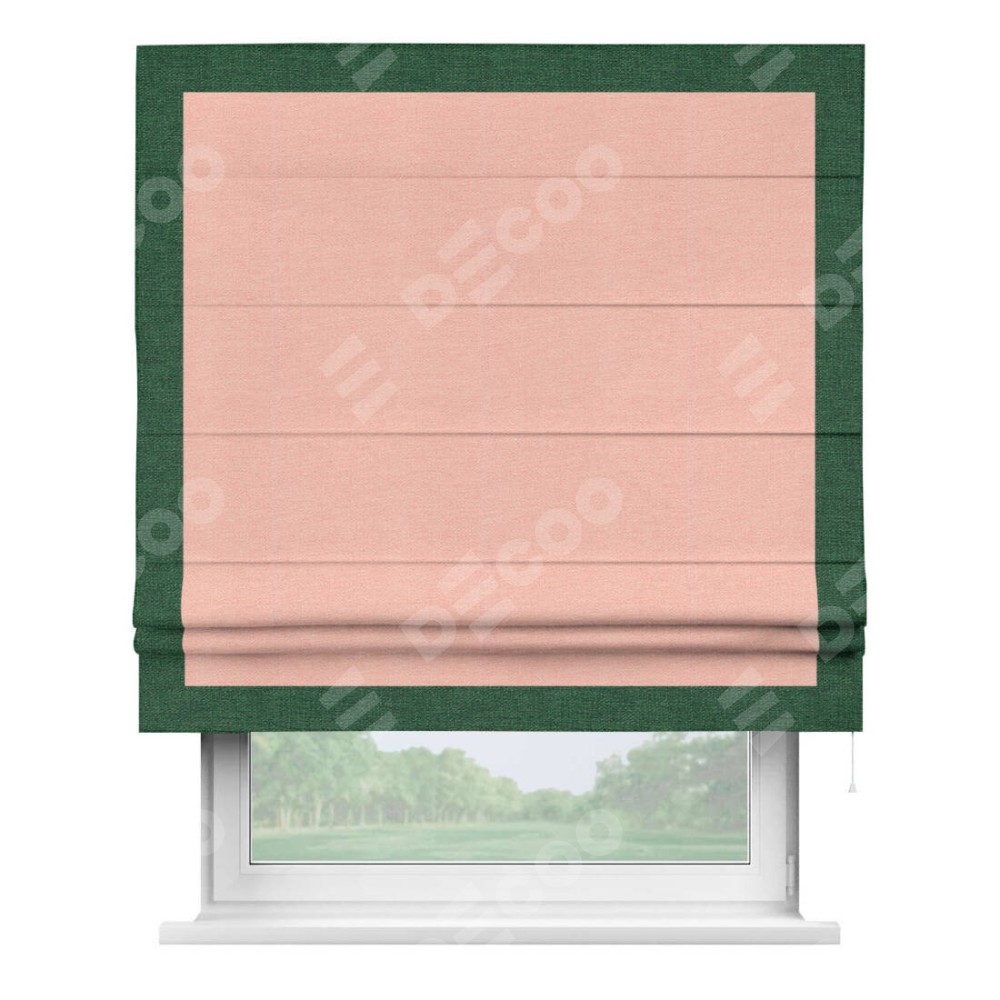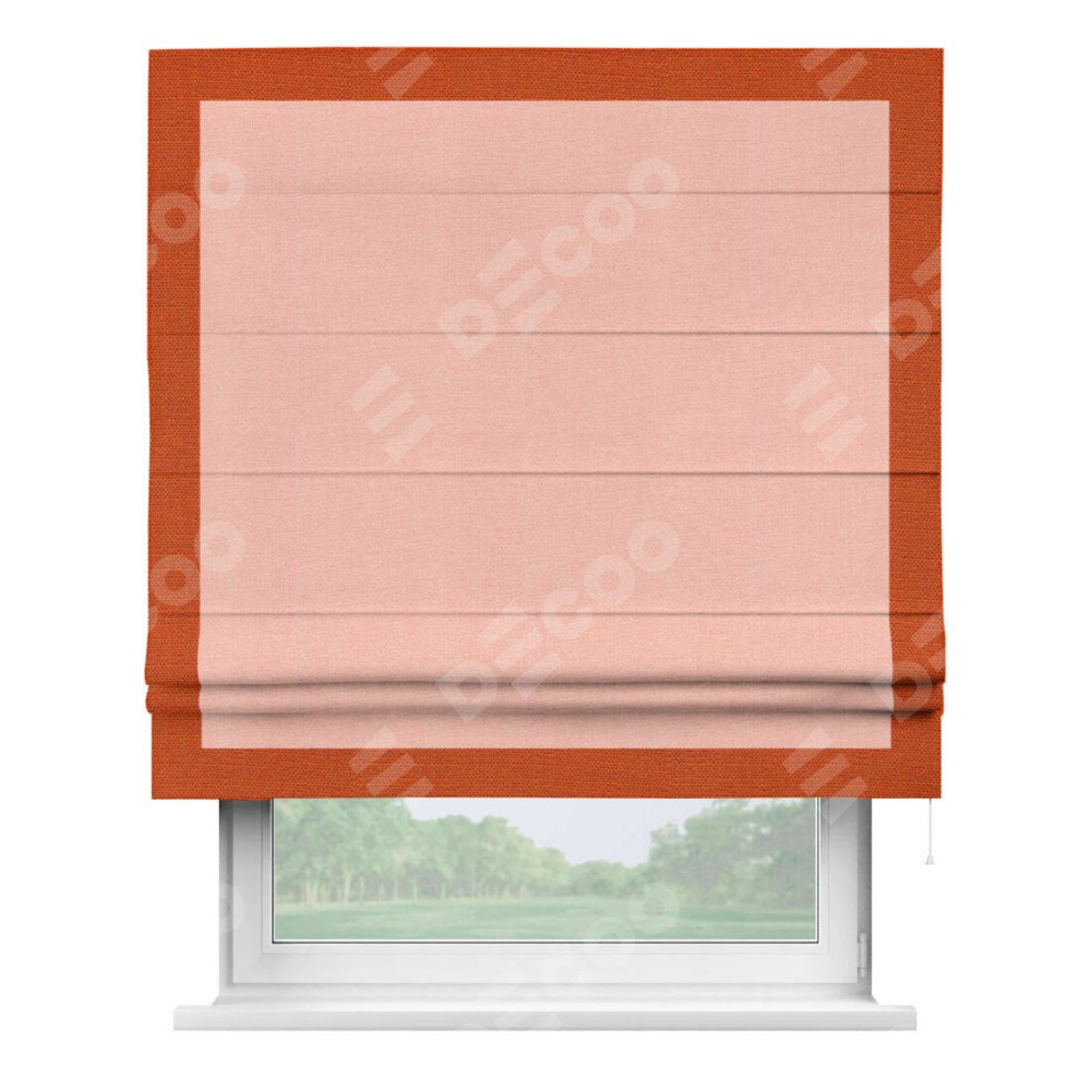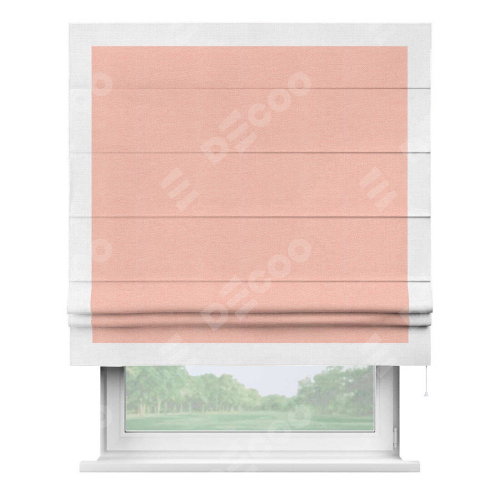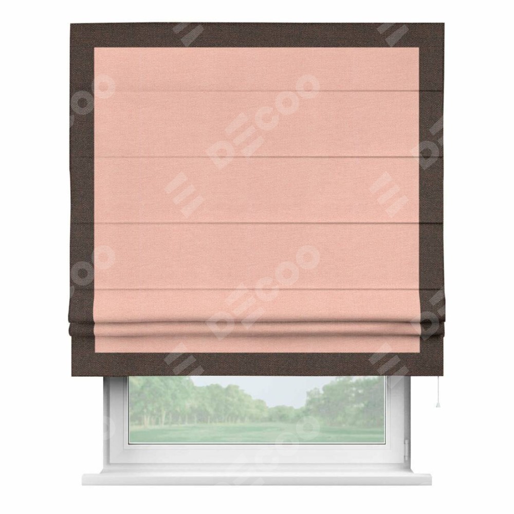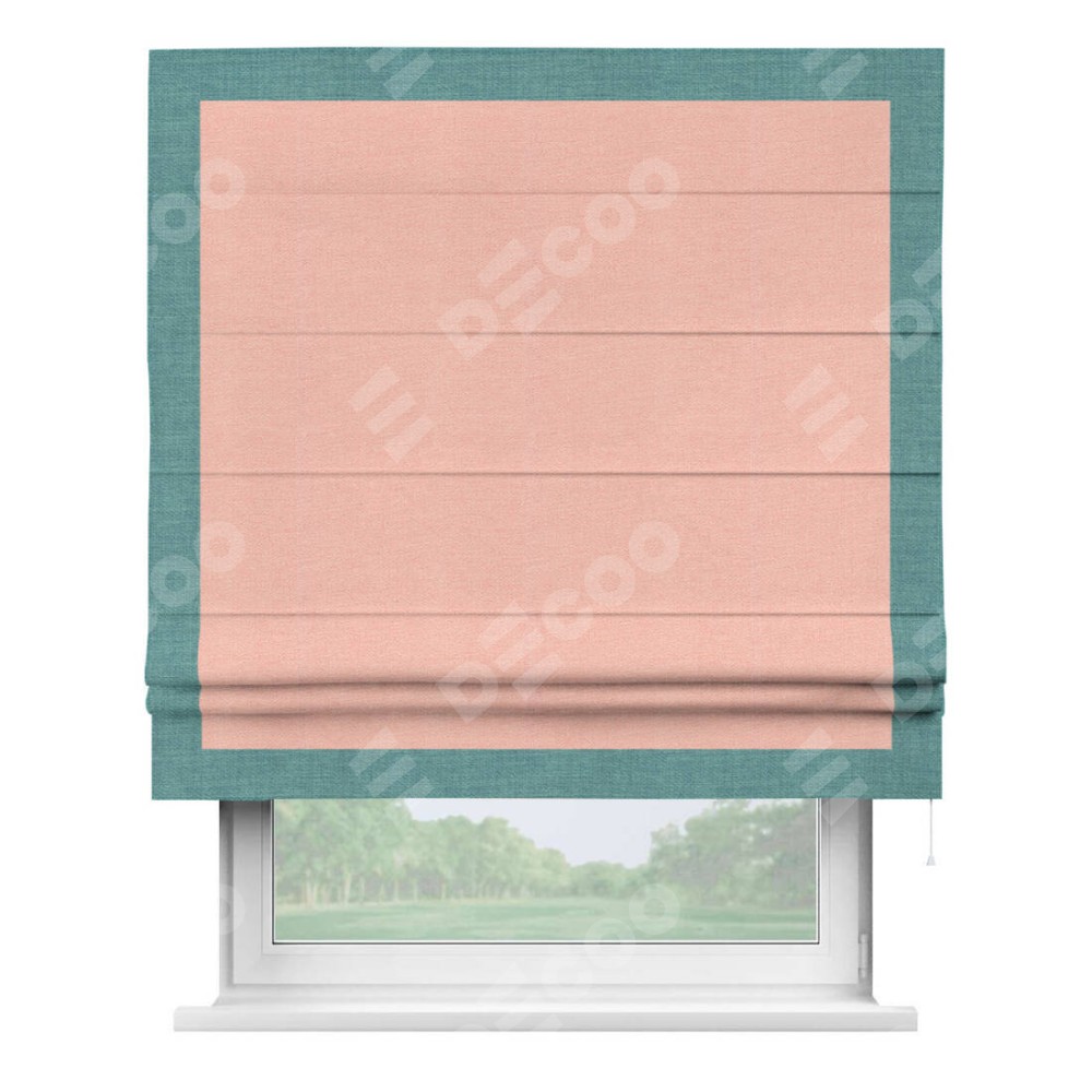 Римская штора производителя «Cortin», используется для проёма, пошита из ткани лён розовый, артикул 00005. Отделка шторы кантом «Чесс», ткань для канта используется из льна разной расцветки на выбор. Имеет универсальный механизм и подходит для монтажа: на потолок, на стену и в нишу.