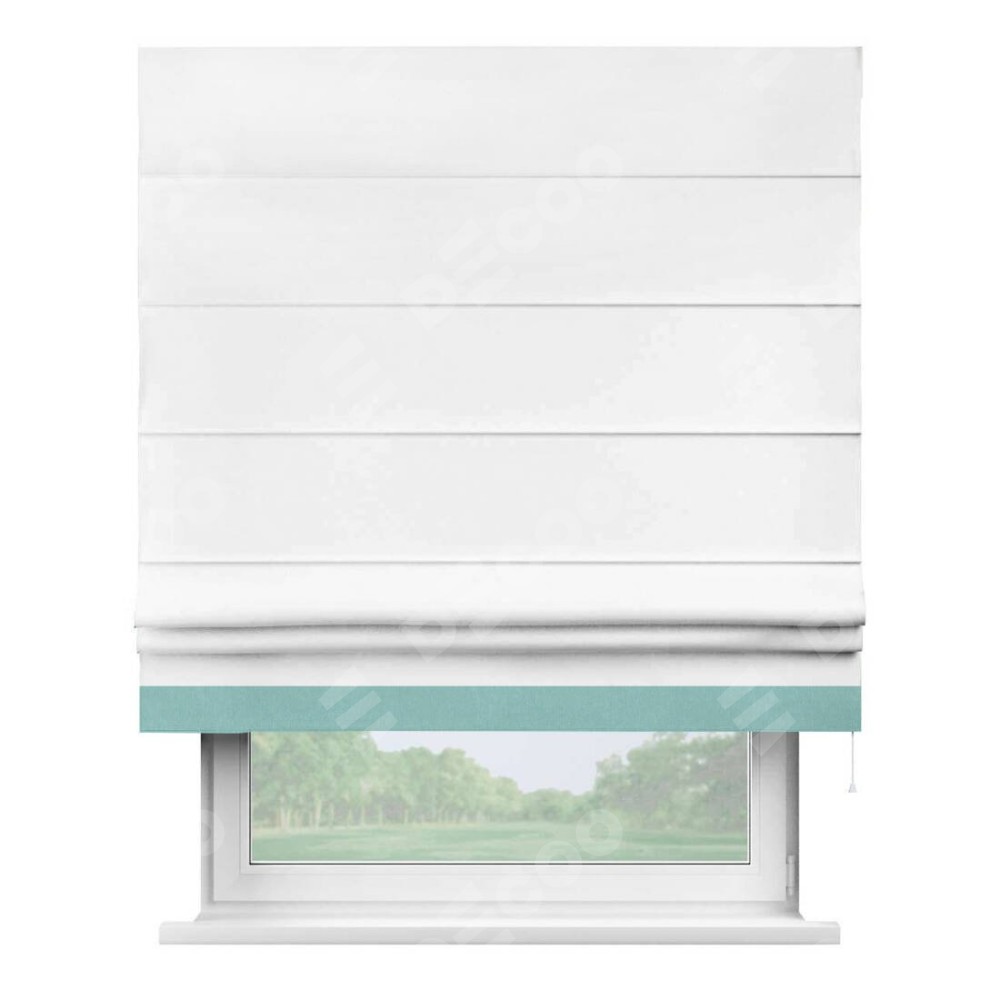 Римская штора производителя «Cortin», используется для проёма, пошита из ткани вельвет белоснежный, артикул ткани 19192. Отделка шторы кантом «Джестер», ткань для канта используется из вельвета разной расцветки на выбор. Имеет универсальный механизм и подходит для монтажа: на потолок, на стену и в нишу.