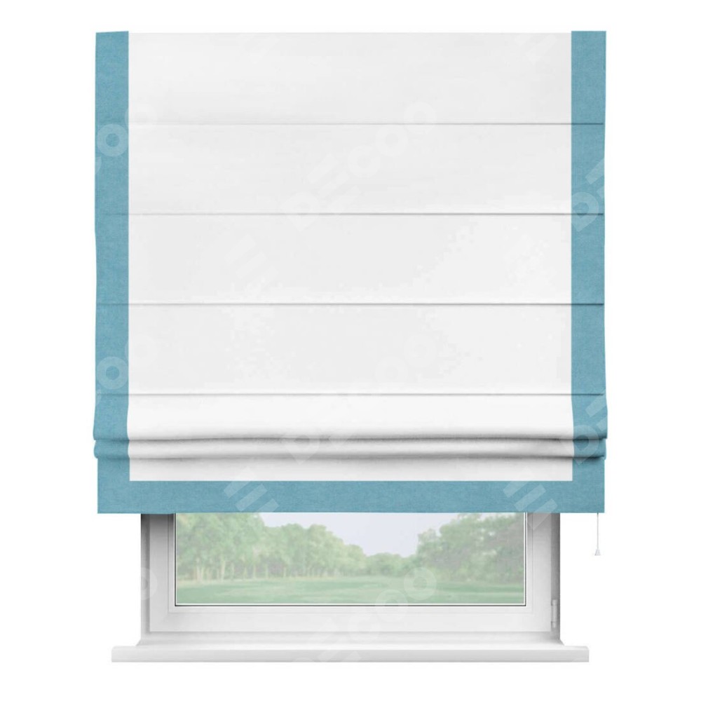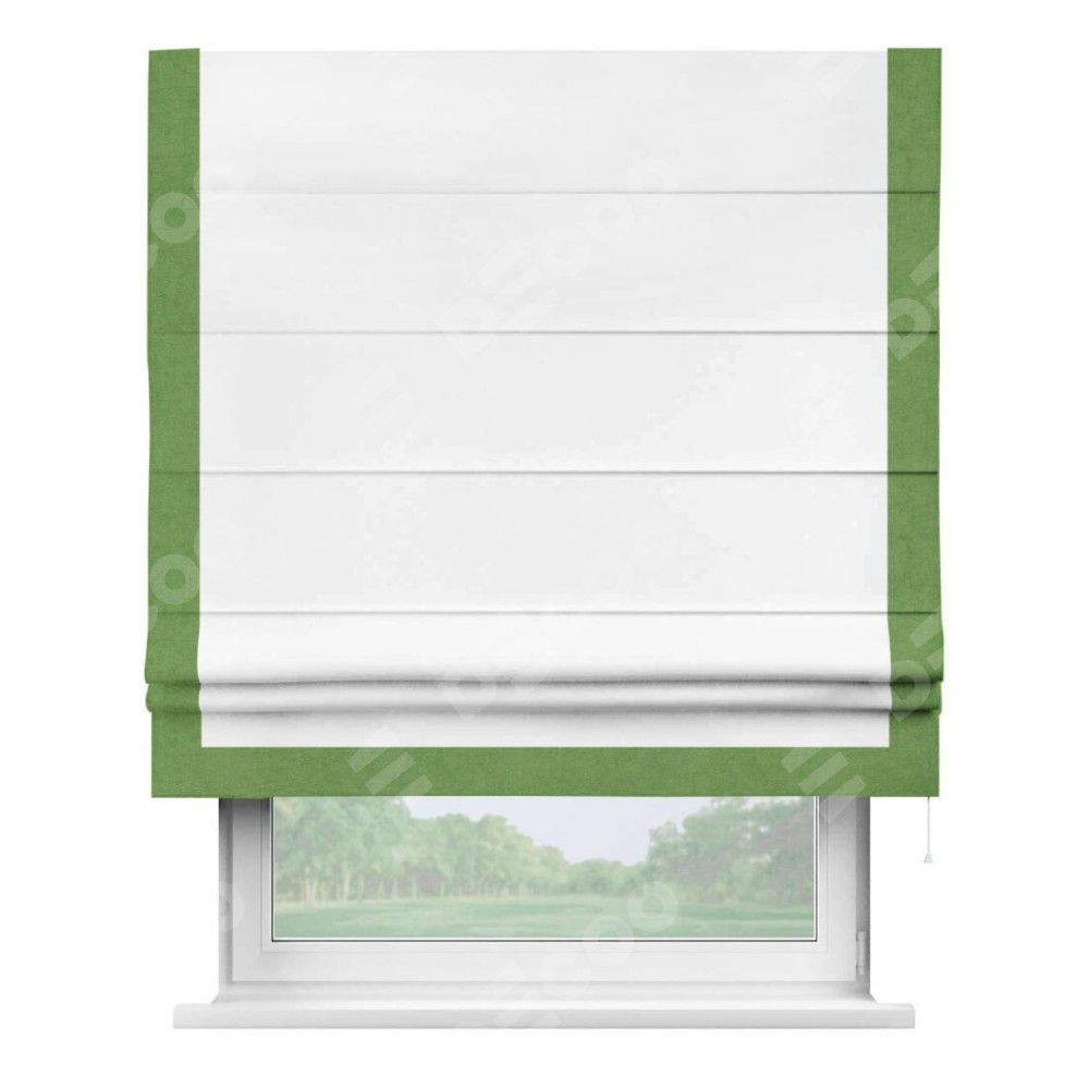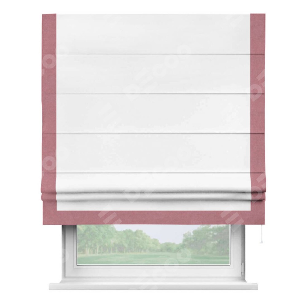 Римская штора производителя «Cortin», используется для проёма, пошита из ткани вельвет белоснежный, артикул ткани 19192. Отделка шторы кантом «Виктория», ткань для канта используется из вельвета разной расцветки на выбор. Имеет универсальный механизм и подходит для монтажа: на потолок, на стену и в нишу.