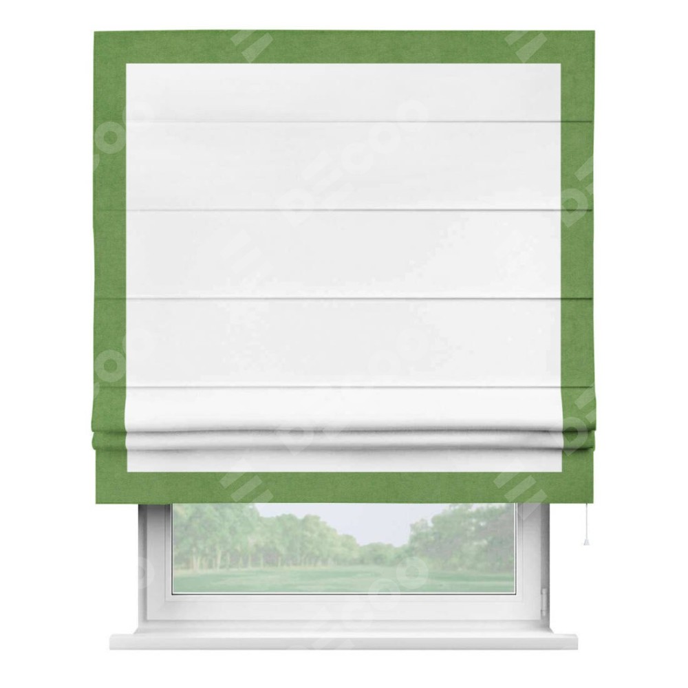 Римская штора производителя «Cortin», используется для проёма, пошита из ткани вельвет белоснежный, артикул ткани 19192. Отделка шторы кантом «Чесс», ткань для канта используется из вельвета разной расцветки на выбор. Имеет универсальный механизм и подходит для монтажа: на потолок, на стену и в нишу.