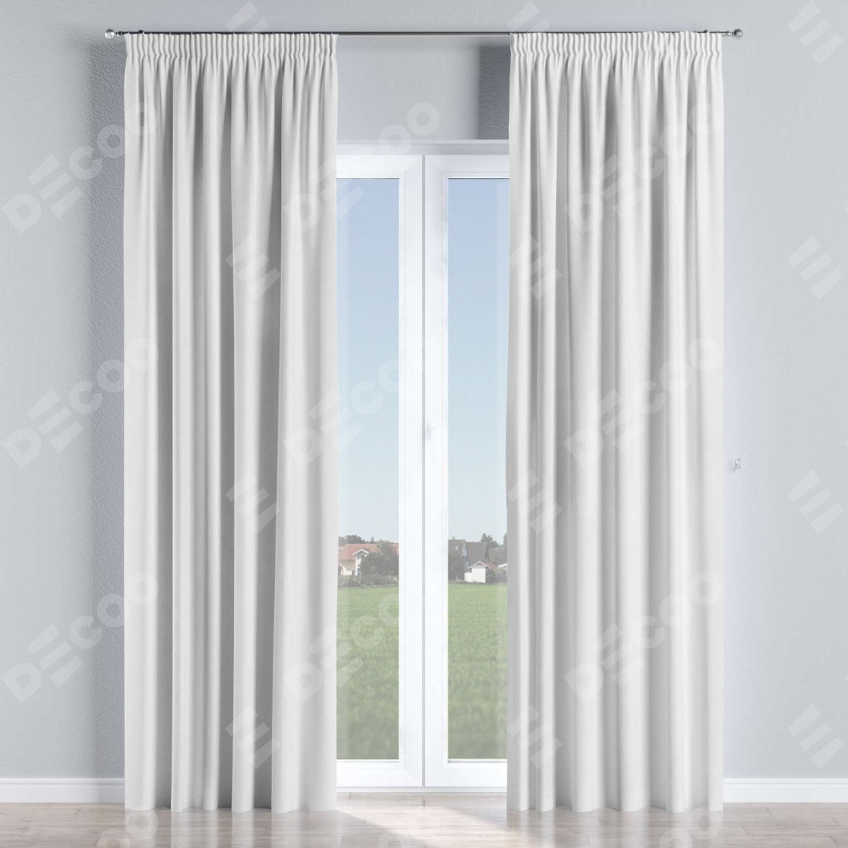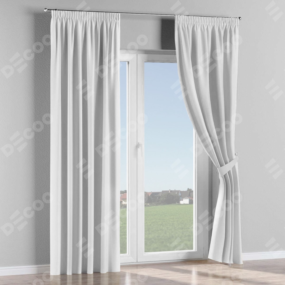 Комплект прямых штор, от производителя «Cortin», пошиты из ткани однотонная белоснежная, артикул ткани 41217. С изнаночной стороны в верхней части штор пристрачивается шторная лента с декоративными складками «Карандаш». Для создания элегантных складок прямые шторы шьются по стандарту с коэффициентом 1:2 (на 100 см. ширины проёма 200 см. ширины ткани).