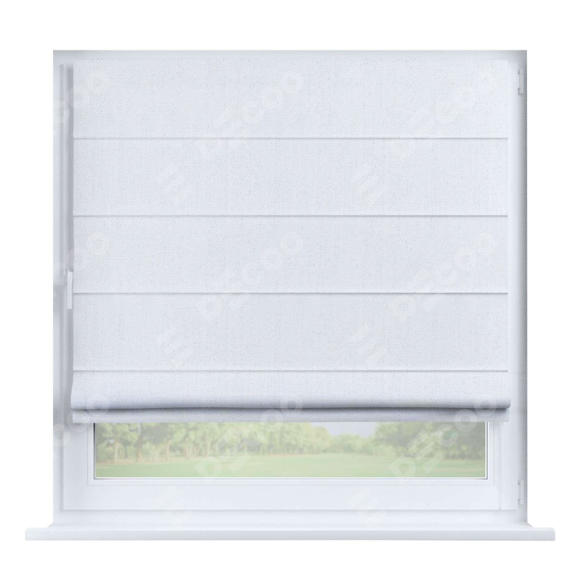 Римская штора производителя «Cortin», устанавливается на створку окна, пошита из ткани лён белоснежный, артикул 7438. Штора шьётся по индивидуальным размерам, для данного типа римской шторы возможная ширина от 35 до 150 см., высота до 250 см.