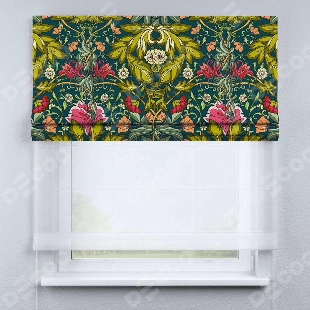 Римская штора день-ночь производителя «Cortin», используется для проёма, пошита из двух полотен, с лицевой блэкаут с нанесением сублимационной печати «Цветок морриса», вторая ткань тюль (по стандарту комплектуется тюль белого цвета артикул V-01). Имеет универсальный механизм и подходит для монтажа: на потолок, на стену и в нишу.
