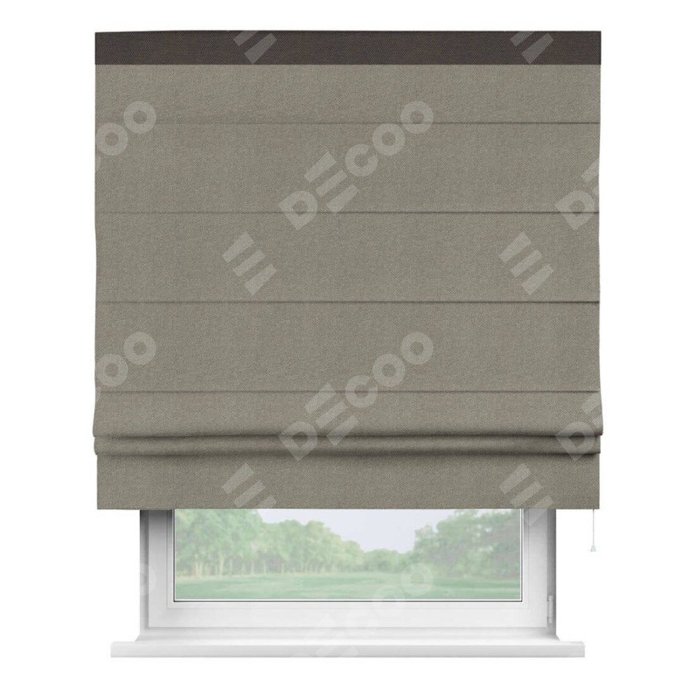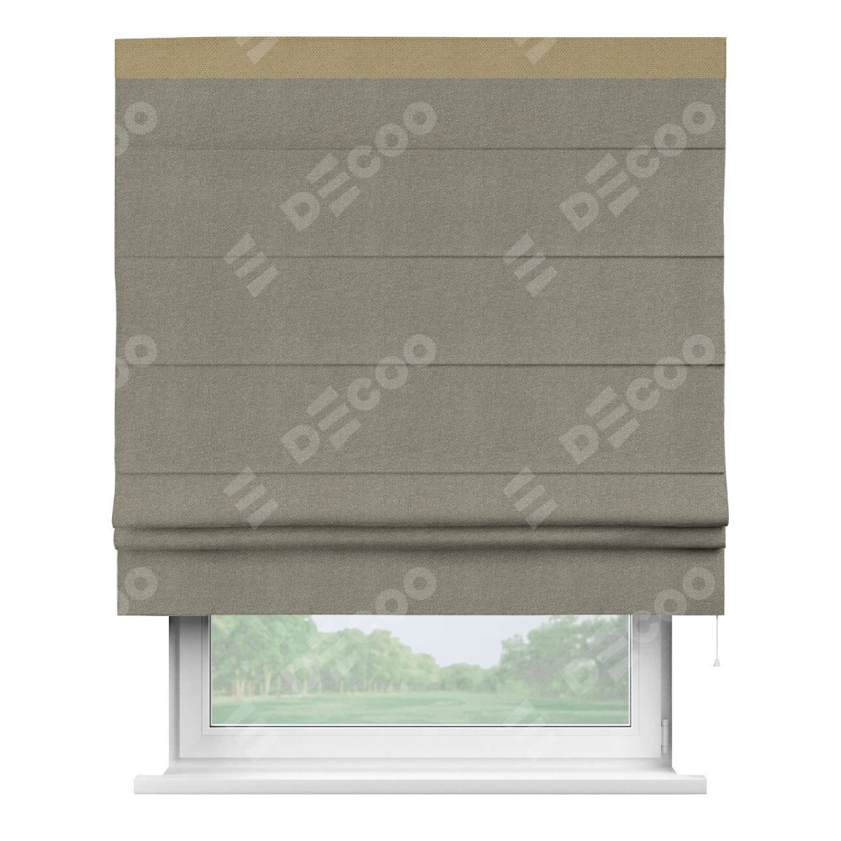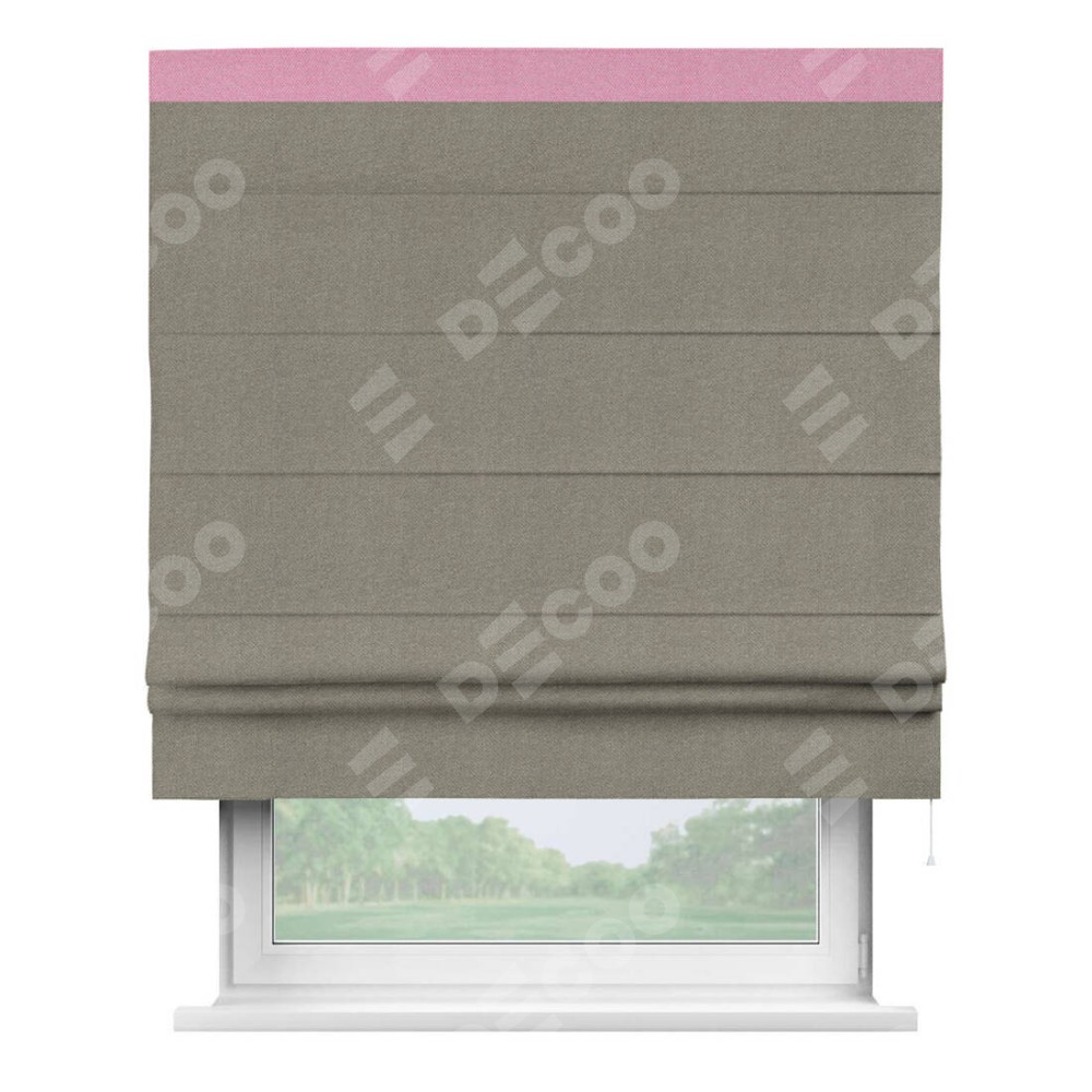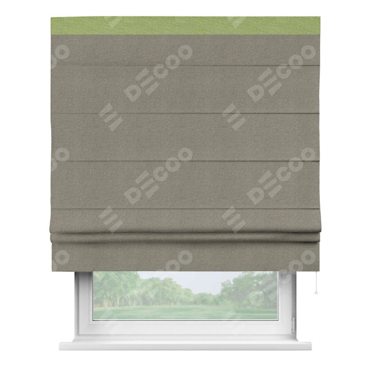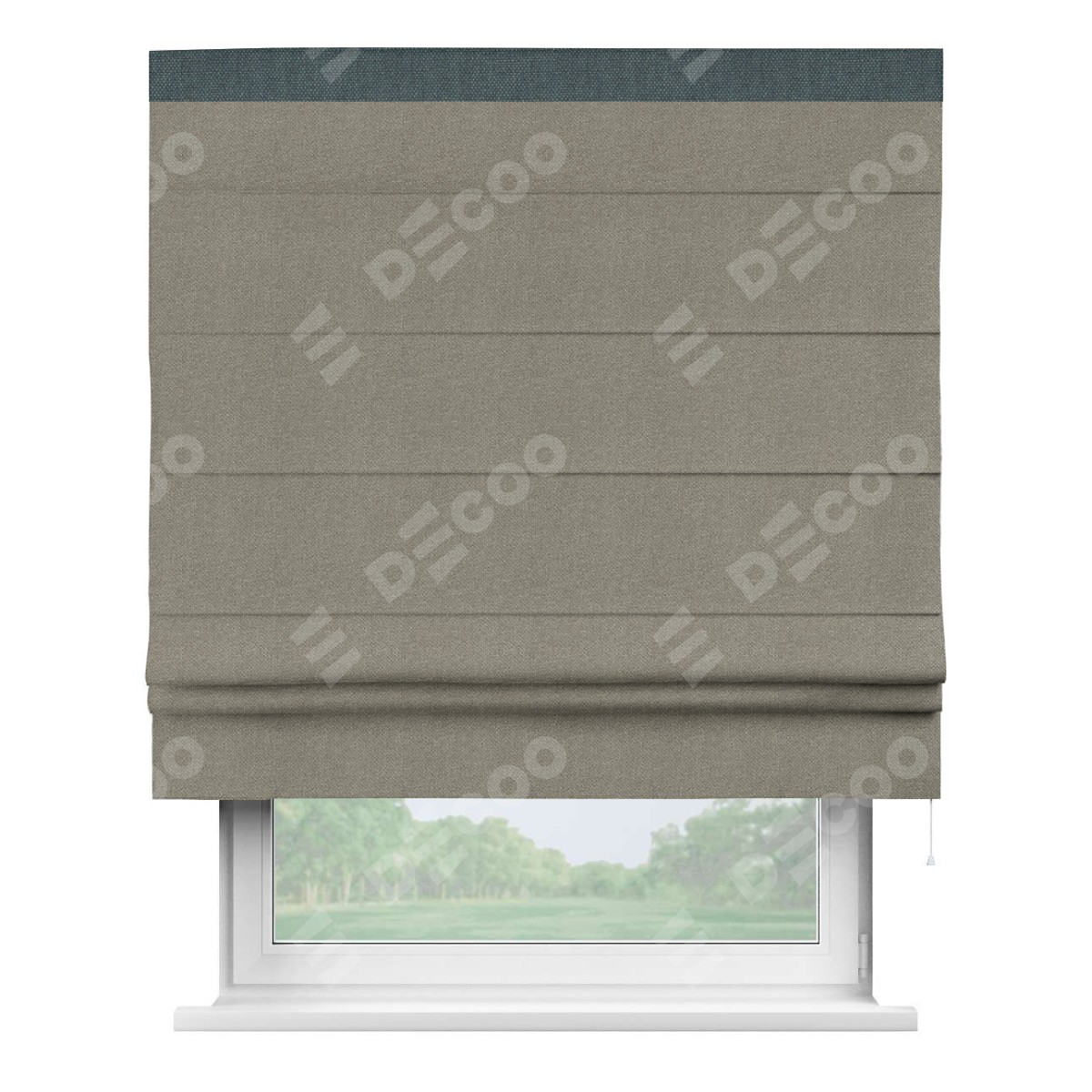 Римская штора производителя «Cortin», используется для проёма, пошита из ткани лён димаут cеро-зелёный, артикул 00003. Отделка шторы кантом «Кинг», ткань для канта используется из льна димаут разной расцветки на выбор. Имеет универсальный механизм и подходит для монтажа: на потолок, на стену и в нишу.
