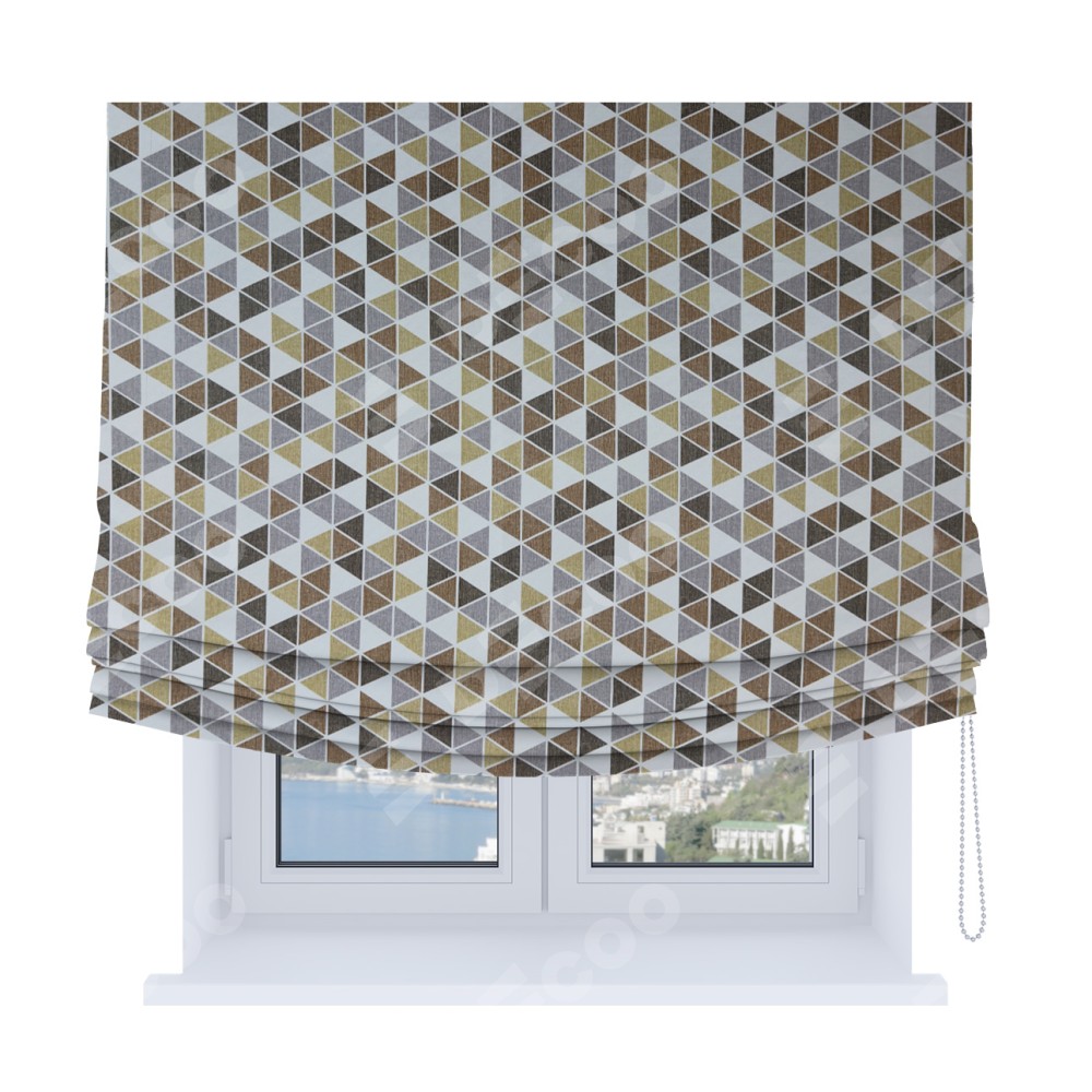 Римская штора Soft производителя «Cortin», используется для проёма, пошита из ткани димаут «Треугольники коричневые», артикул ткани 23021. Имеет универсальный механизм и подходит для монтажа: на потолок, на стену и в нишу. В отличие от стандартных римских штор, римская штора Soft не имеет горизонтальных вставок и нижнего отвеса. Это позволяет ткани произвольно драпироваться в свободные мягкие складки.