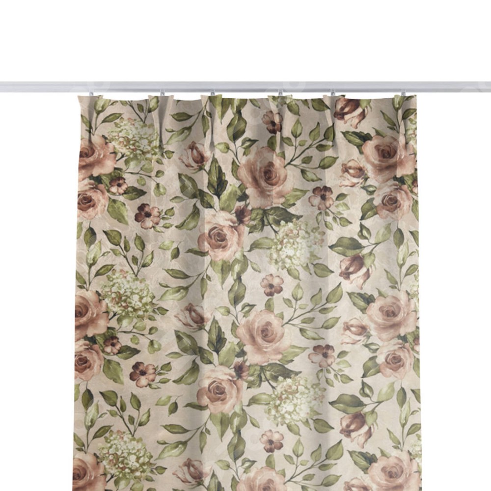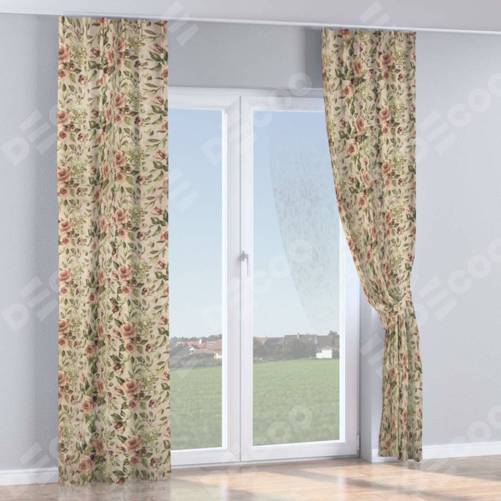 Комплект прямых штор, от производителя «Cortin», пошиты из ткани «Розы бежевые», артикул ткани 34564. С изнаночной стороны в верхней части штор пристрачивается шторная лента с декоративными складками «Кустик». Для создания элегантных складок прямые шторы шьются по стандарту с коэффициентом 1:2 (на 100 см. ширины проёма 200 см. ширины ткани).