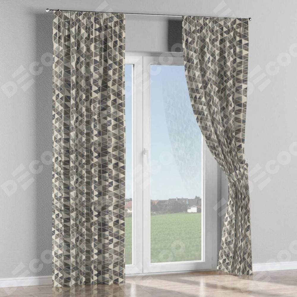 Комплект прямых штор, от производителя «Cortin», пошиты из ткани димаут «Треугольники синие», артикул ткани 23022. С изнаночной стороны в верхней части штор пристрачивается шторная лента с декоративными складками «Карандаш». Для создания элегантных складок прямые шторы шьются по стандарту с коэффициентом 1:2 (на 100 см. ширины проёма 200 см. ширины ткани).