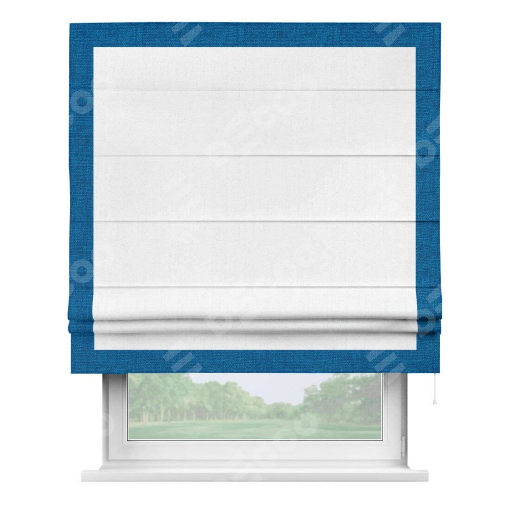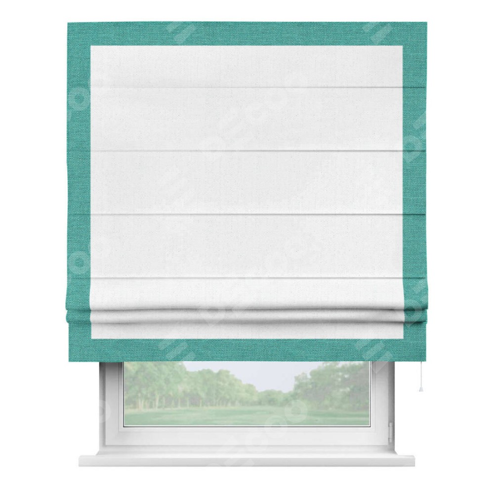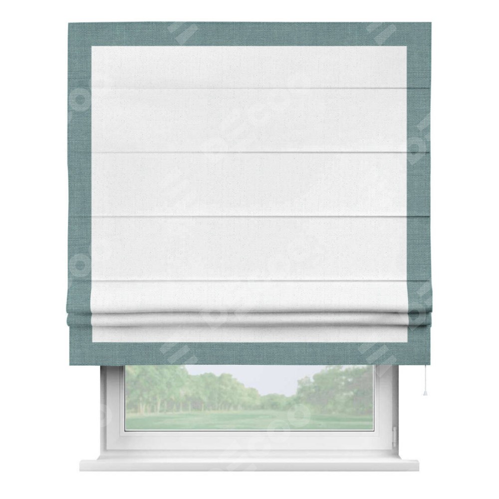 Римская штора производителя «Cortin», используется для проёма, пошита из ткани лён белоснежный, артикул 7438. Отделка шторы кантом «Чесс», ткань для канта используется из льна разной расцветки на выбор. Имеет универсальный механизм и подходит для монтажа: на потолок, на стену и в нишу.