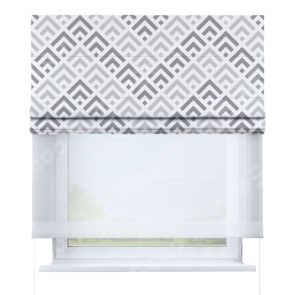 Римская штора день-ночь производителя «Cortin», используется для проёма, пошита из двух полотен, с лицевой блэкаут с нанесением сублимационной печати «Пространство», вторая ткань тюль (по стандарту комплектуется тюль белого цвета артикул V-01). Имеет универсальный механизм и подходит для монтажа: на потолок, на стену и в нишу.
