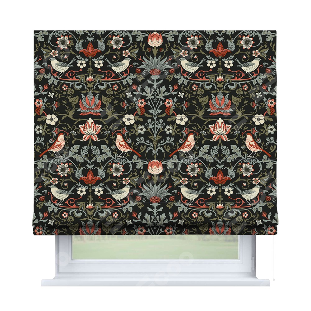 Римская штора производителя «Cortin», используется для проёма, пошита из ткани блэкаут с нанесением сублимационной печати «Зачарованные птицы». Имеет универсальный механизм и подходит для монтажа: на потолок, на стену и в нишу.