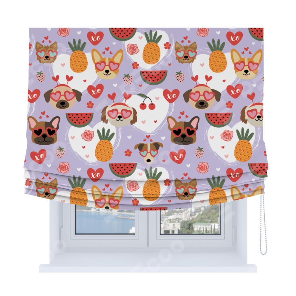 Римская штора Soft производителя «Cortin», используется для проёма, пошита из ткани блэкаут с нанесением сублимационной печати «Забавные собачки». Имеет универсальный механизм и подходит для монтажа: на потолок, на стену и в нишу. В отличие от стандартных римских штор, римская штора Soft не имеет горизонтальных вставок и нижнего отвеса. Это позволяет ткани произвольно драпироваться в свободные мягкие складки.