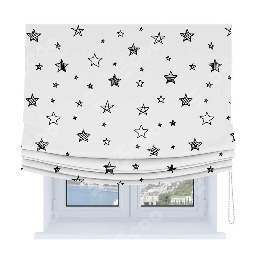 Римская штора Soft производителя «Cortin», используется для проёма, пошита из ткани блэкаут с нанесением сублимационной печати «Звёзды». Имеет универсальный механизм и подходит для монтажа: на потолок, на стену и в нишу. В отличие от стандартных римских штор, римская штора Soft не имеет горизонтальных вставок и нижнего отвеса. Это позволяет ткани произвольно драпироваться в свободные мягкие складки.